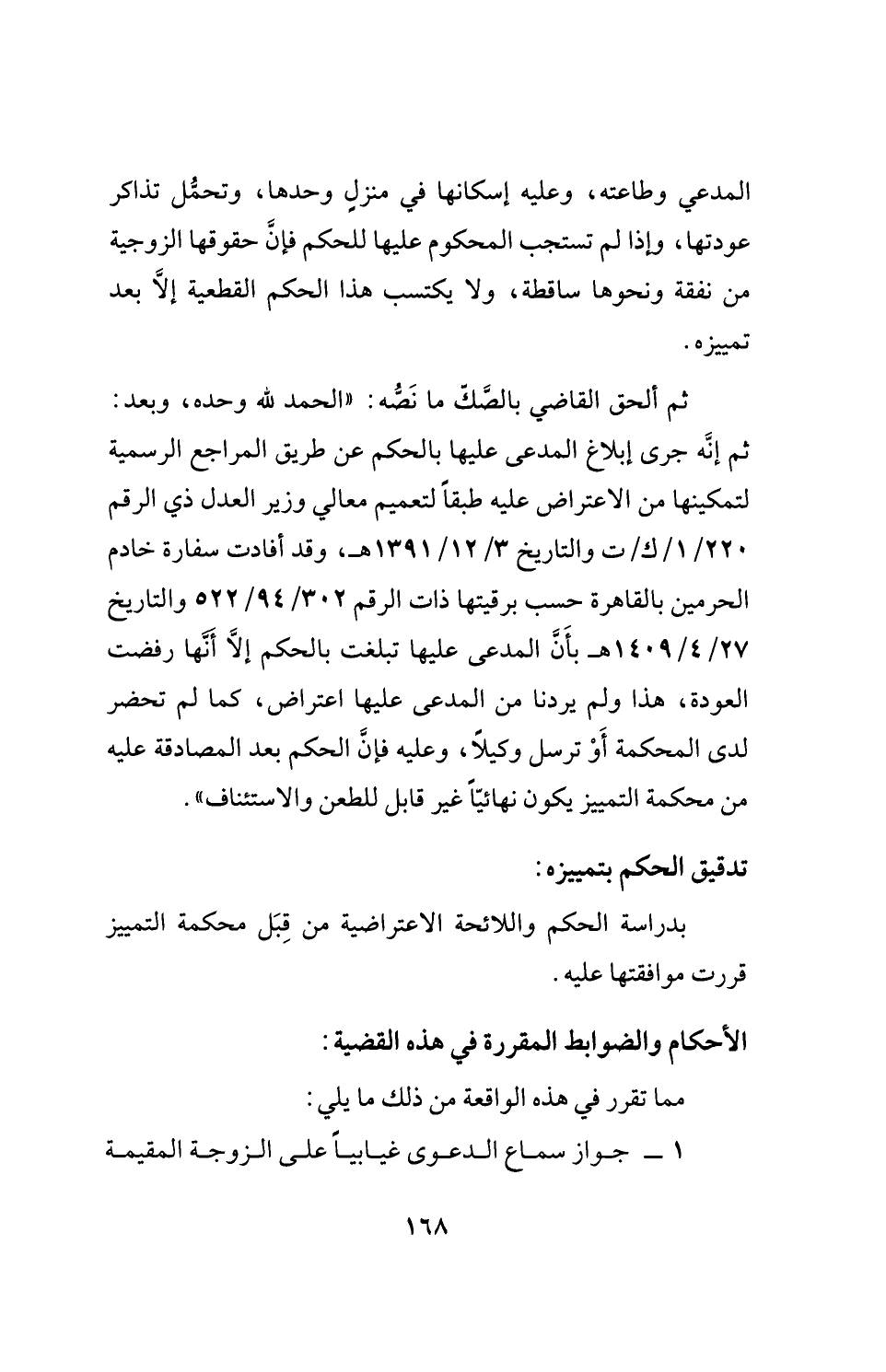 ثم ألحق القاضي بالصَّك ما نَصُّه: "الحمد لله وحده، وبعد: ثم إنَّه جرى إبلاع المدعى عليها بالحكم عن طريق المراجع الرسمية لتمكينها من الاعتراض عليه طبقًا لتعميم معالي وزير العدل ذي الرقم 220/ 1/ ك/ ت والتاريخ 3/ 12/ 1391 هـ، وقد أفادت سفارة خادم الحرمين بالقاهرة حسب برقيتها ذات الرقم 302/ 94/ 522 والتاريخ 27/ 9/ 1404 هـ بأَنَّ المدعى عليها تبلغت بالحكم إلَّا أَنها رفضت العودة، هذا ولم يردنا من المدعى عليها اعتراض، كما لم تحضر لدى المحكمة أَوْ ترسل وكيلًا، وعليه فإنَّ الحكم بعد المصادقة عليه من محكمة التمييز يكون نهائيًّا غير قابل للطعن والاستئناف".