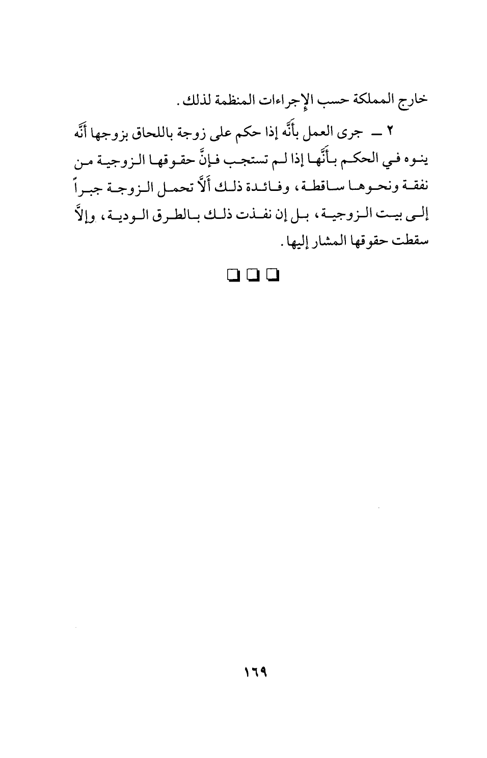 2 - جرى العمل بأَنَّه إذا حكم على زوجة باللحاق بزوجها أَنّه ينوه في الحكم بأَنَّها إذا لم تستجب فإنَّ حقوقها الزوجية من نفقة ونحوها ساقطة، وفائدة ذلك ألَّا تحمل الزوجة جبرًا إلى بيت الزوجية، بل إن نفذت ذلك بالطرق الودية، وإلَّا سقطت حقوقها المشار إليها.