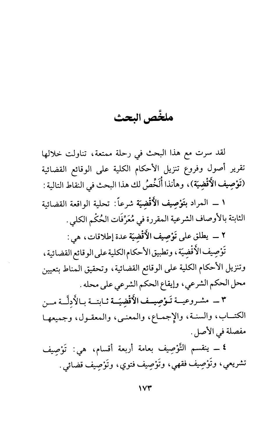 لقد سرت مع هذا البحث في رحلة ممتعة، تناولت خلالها تقرير أصول وفروع تنزيل الأحكام الكلية على الوقائع القضائية (تَوْصِيف الأَقْضِيَة)، وهأنذا ألخِّصُ لك هذا البحث في النقاط التالية: