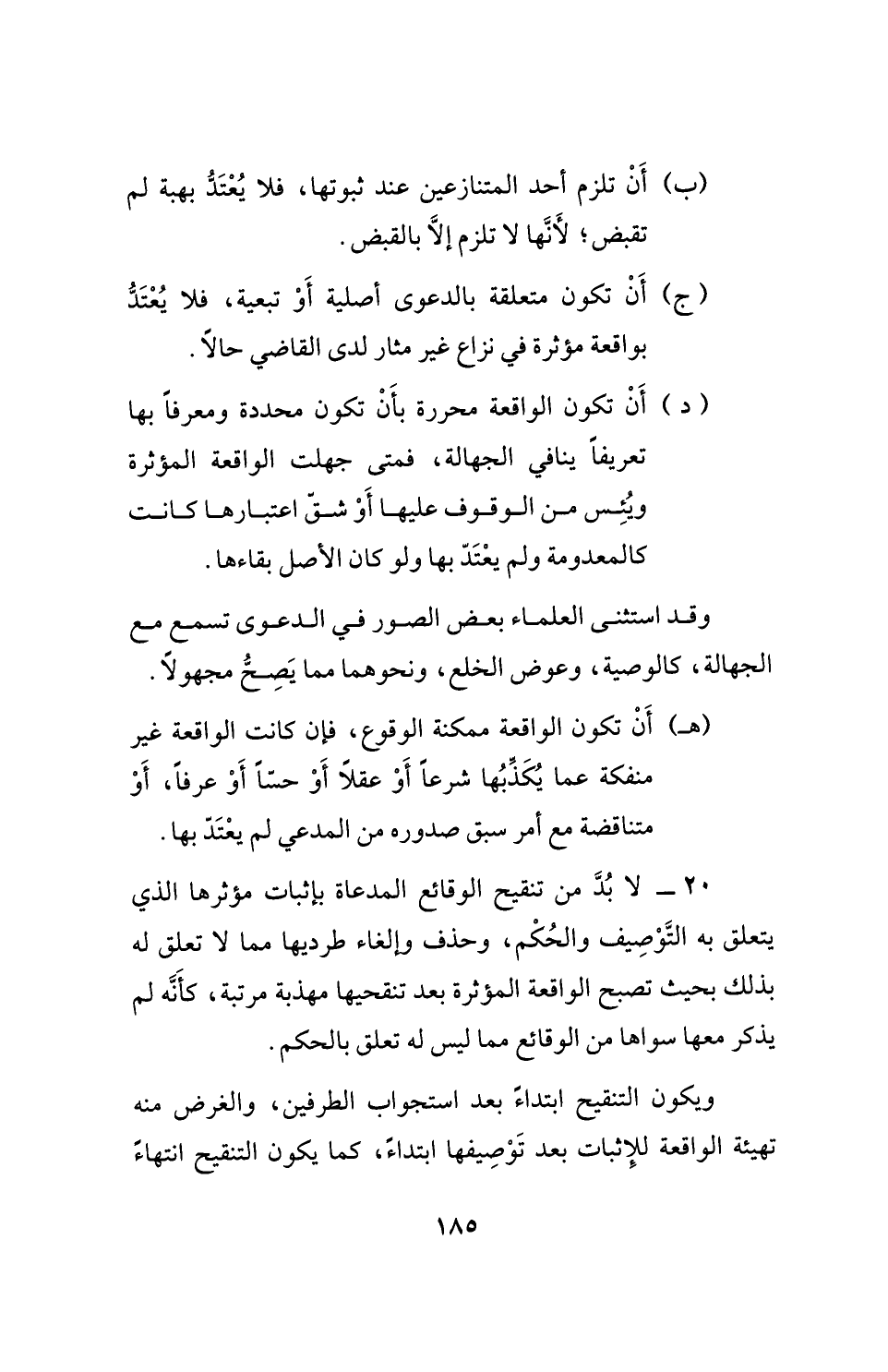 20 - لا بُدَّ من تنقيح الوقائع المدعاة بإثبات مؤثرها الذي يتعلق به التَّوْصِيف والحُكْم، وحذف وإلغاء طرديها مما لا تعلق له بذلك بحيث تصبح الواقعة المؤثرة بعد تنقحيها مهذبة مرتبة، كأَنَّه لم يذكر معها سواها من الوقائع مما ليس له تعلق بالحكم.
