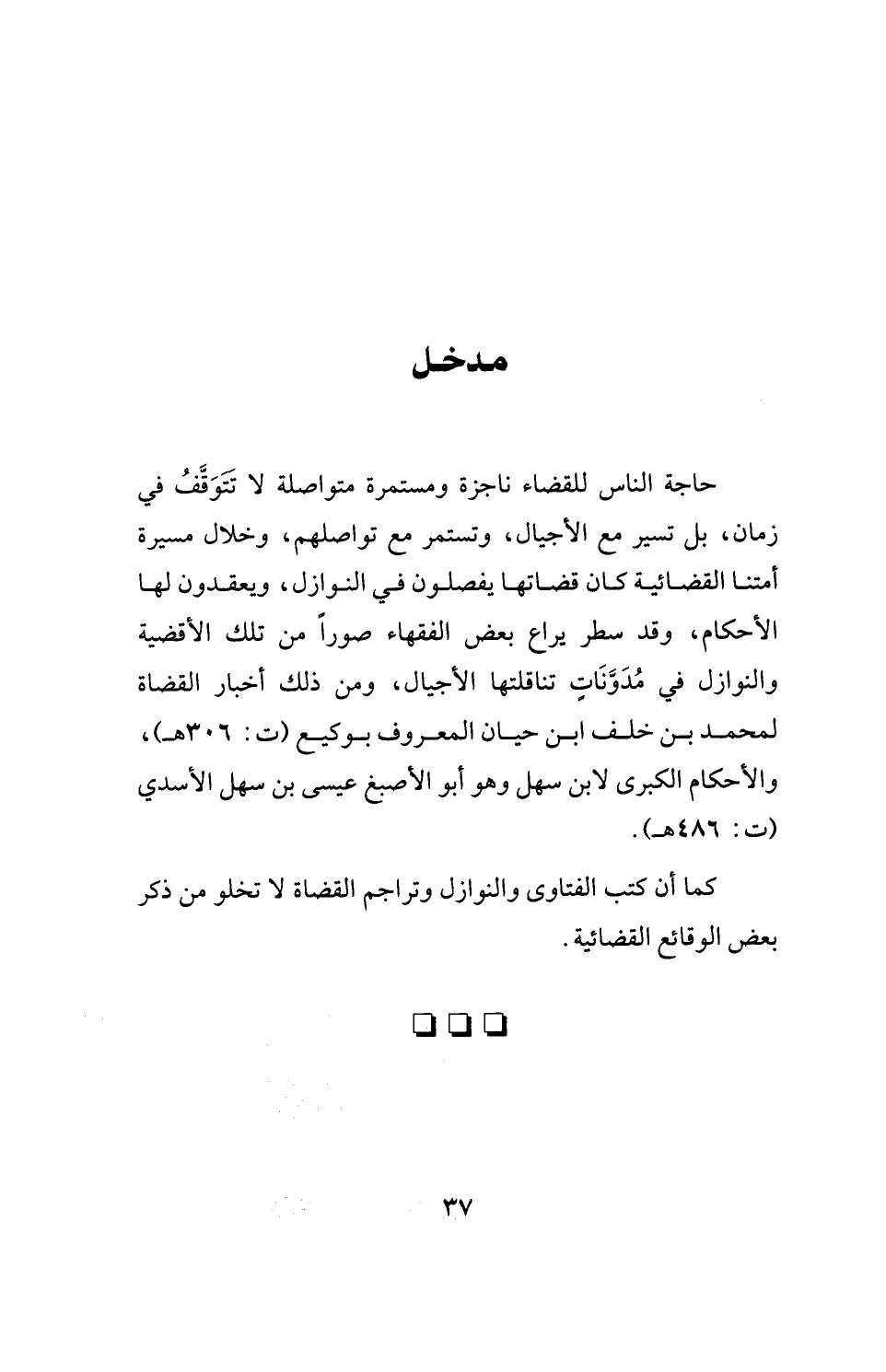 حاجة الناس للقضاء ناجزة ومستمرة متواصلة لا تتوَقَّفُ في زمان، بل تسير مع الأجيال، وتستمر مع تواصلهم، وخلال مسيرة أمتنا القضائية كان قضاتها يفصلون في النوازل، ويعقدون لها الأحكام، وقد سطر يراع بعض الفقهاء صورًا من تلك الأقضية والنوازل في مُدَوَّنَاتٍ تناقلتها الأجيال، ومن ذلك أخبار القضاة لمحمد بن خلف ابن حيان المعروف بوكيع (ت: 306 هـ)، والأحكام الكبرى لابن سهل وهو أبو الأصبغ عيسى بن سهل الأسدي (ت: 486 هـ).