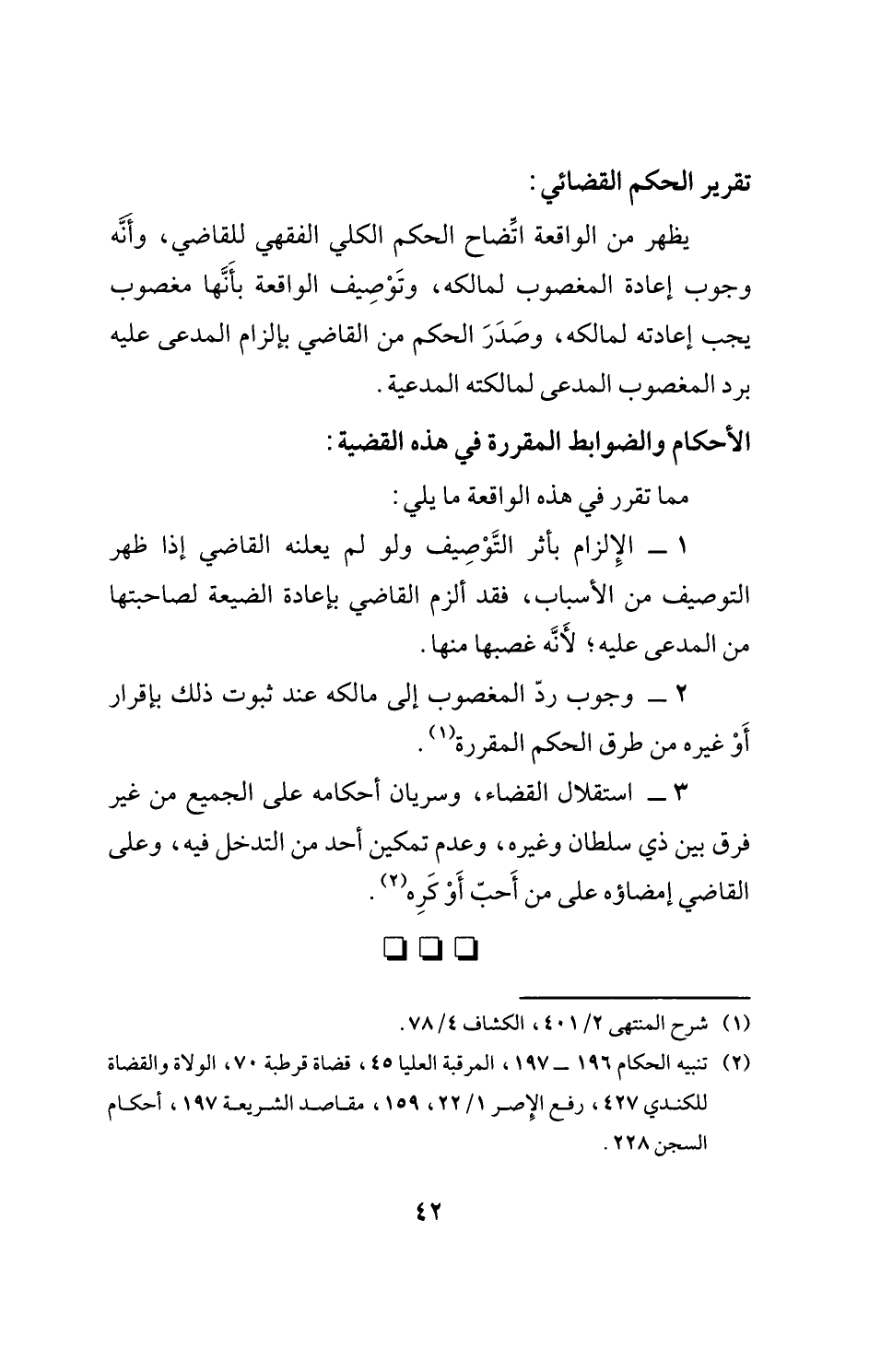 يظهر من الواقعة اتِّضاح الحكم الكلي الفقهي للقاضي، وأَنّه وجوب إعادة المغصوب لمالكه، وتَوْصِيف الواقعة بأَنَّها مغصوب يجب إعادته لمالكه، وصَدَرَ الحكم من القاضي بإلزام المدعى عليه برد المغصوب المدعى لمالكته المدعية.