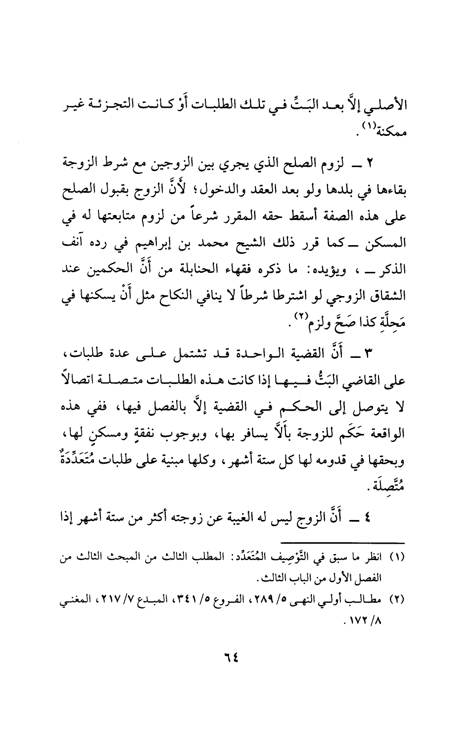 2 - لزوم الصلح الذي يجري بين الزوجين مع شرط الزوجة بقاءها في بلدها ولو بعد العقد والدخول؛ لأَنَّ الزوج بقبول الصلح على هذه الصفة أسقط حقه المقرر شرعًا من لزوم متابعتها له في المسكن -كما قرر ذلك الشيح محمد بن إبراهيم في رده آنف الذكر-، ويؤيده: ما ذكره فقهاء الحنابلة من أَنَّ الحكمين عند الشقاق الزوجي لو اشترطا شرطًا لا ينافي النكاح مثل أَنْ يسكنها في مَحِلَّةِ كذا صَحَّ ولزم (¬2).