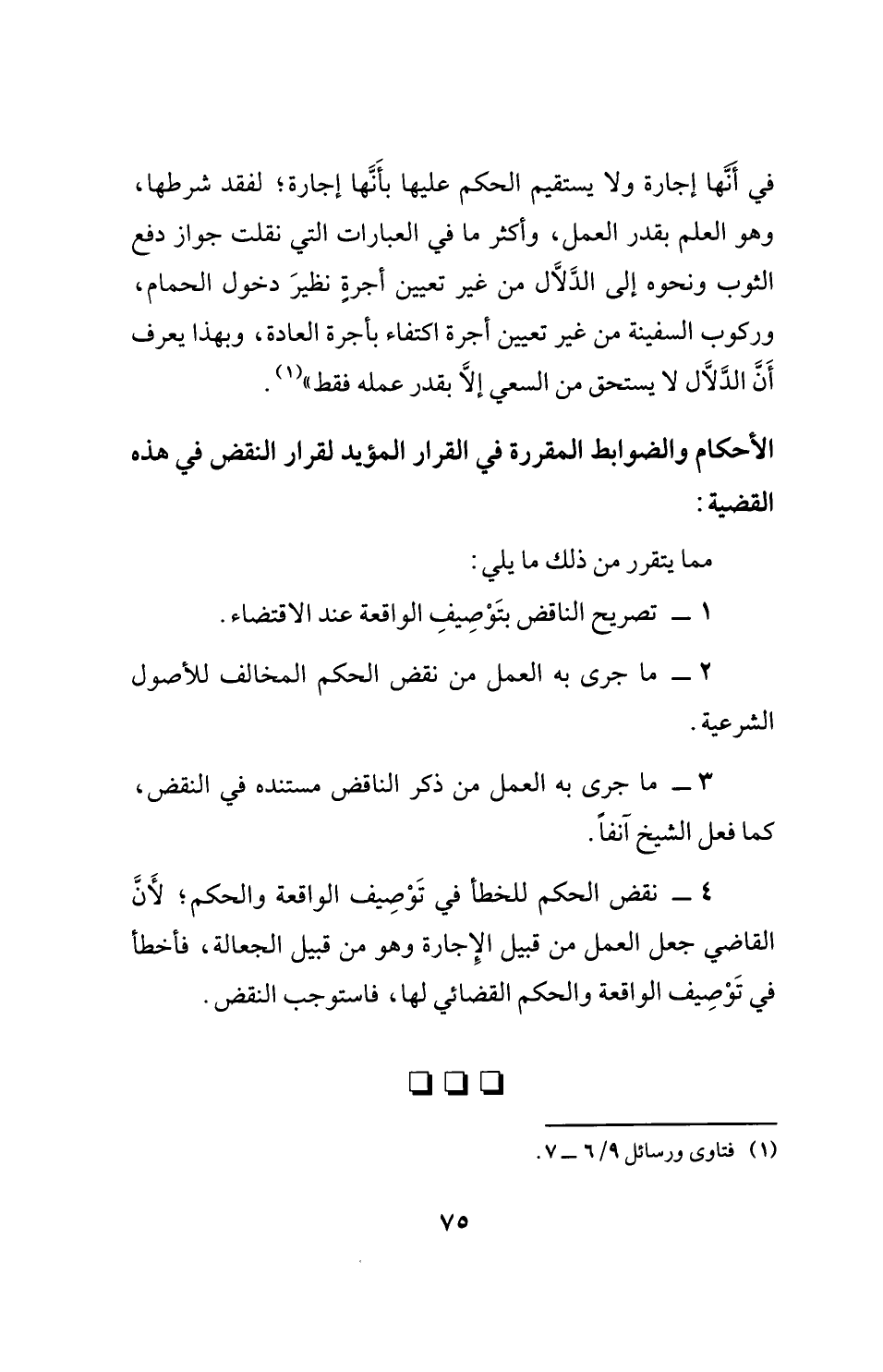 4 - نقض الحكم للخطأ في تَوْصِيف الواقعة والحكم؛ لأَنَّ القاضي جعل العمل من قبيل الإجارة وهو من قبيل الجعالة، فأخطأ في تَوْصِيف الواقعة والحكم القضائي لها، فاستوجب النقض.