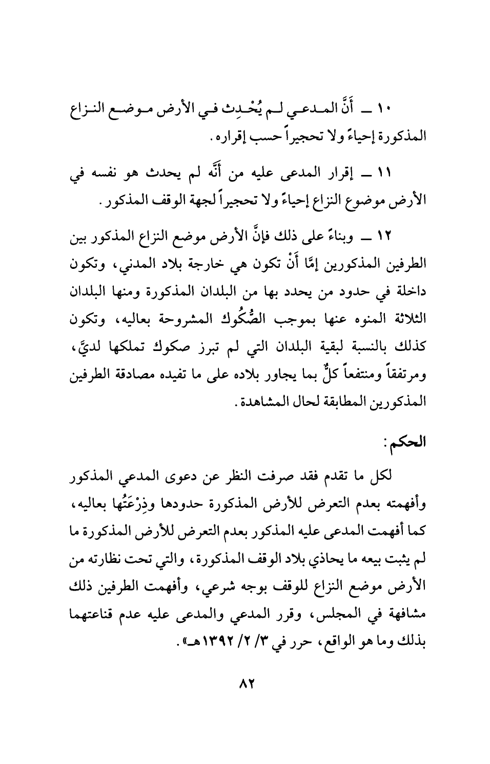 لكل ما تقدم فقد صرفت النظر عن دعوى المدعي المذكور وأفهمته بعدم التعرض للأرض المذكورة حدودها وذِرْعَتُها بعاليه، كما أفهمت المدعى عليه المذكور بعدم التعرض للأرض المذكورة ما لم يثبت بيعه ما يحاذي بلاد الوقف المذكورة، والتي تحت نظارته من الأرض موضع النزاع للوقف بوجه شرعي، وأفهمت الطرفين ذلك مشافهة في المجلس، وقرر المدعي والمدعى عليه عدم قناعتهما بذلك وما هو الواقع، حرر في 3/ 2/ 1392 هـ".