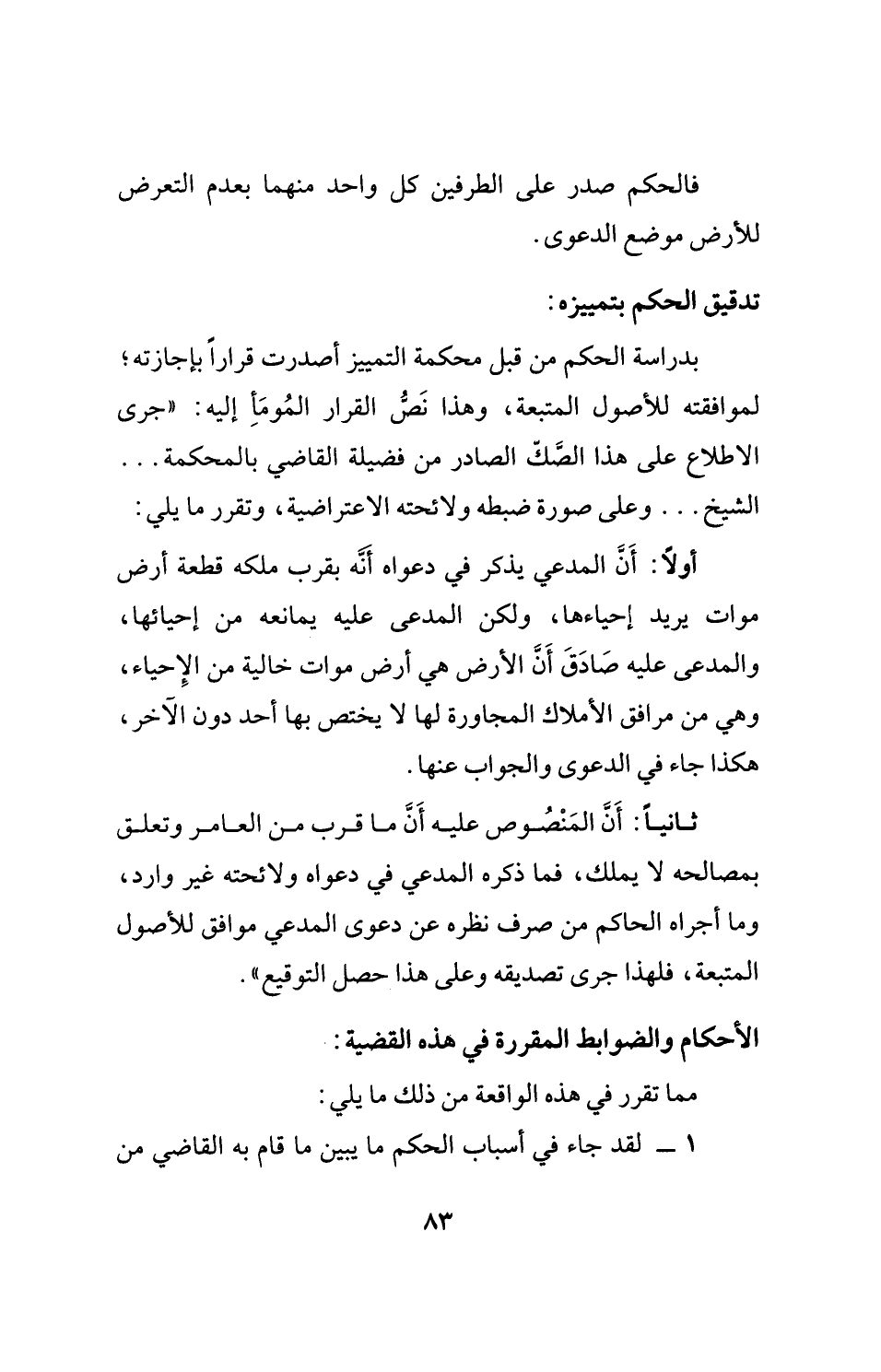 ثانيًا: أَنَّ المَنْصُوص عليه أَنَّ ما قرب من العامر وتعلق بمصالحه لا يملك، فما ذكره المدعي في دعواه ولائحته غير وارد، وما أجراه الحاكم من صرف نظره عن دعوى المدعي موافق للأصول المتبعة، فلهذا جرى تصديقه وعلى هذا حصل التوقيع".