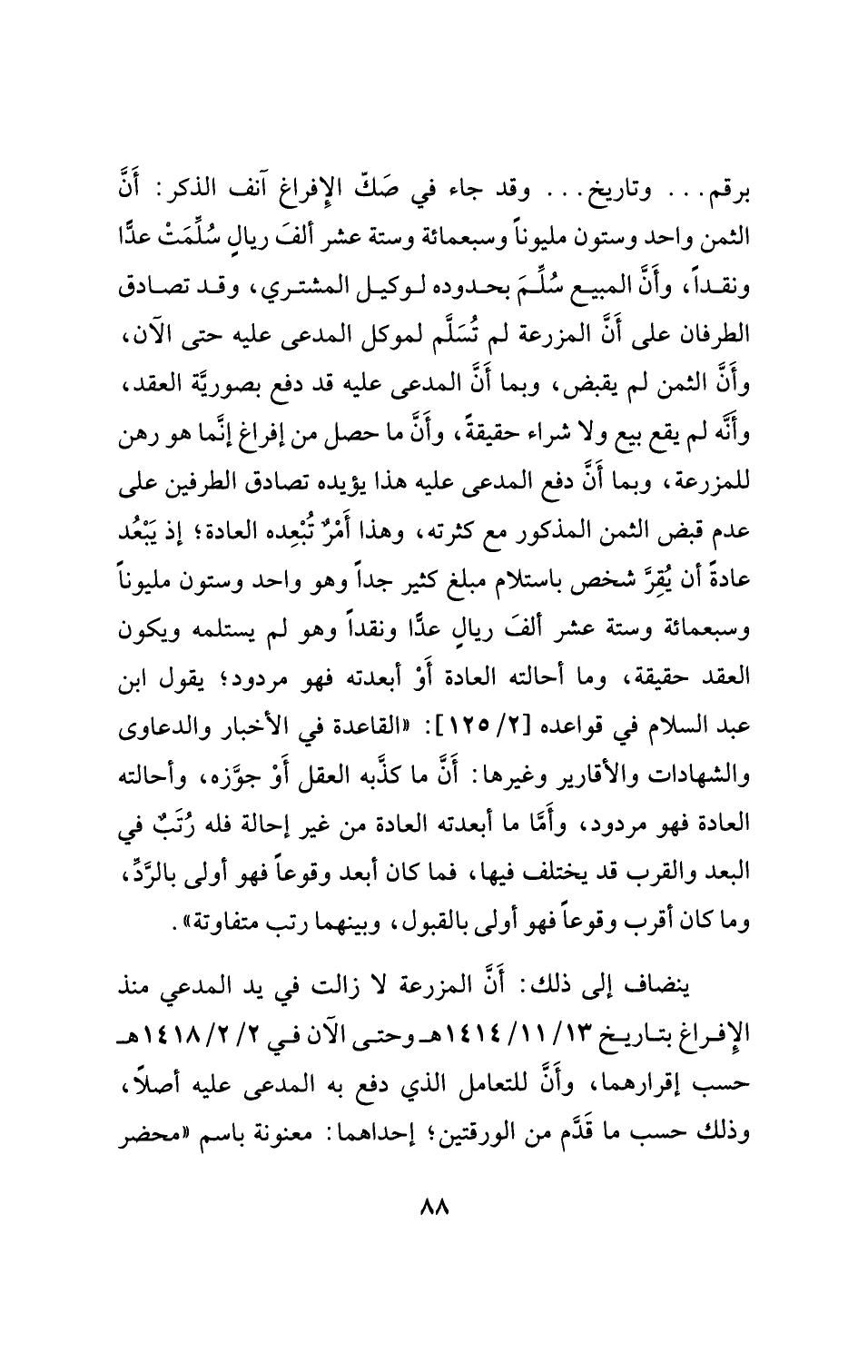 برقم ... وتاريخ ... وقد جاء في صَكّ الإفراغ آنف الذكر: أَنَّ الثمن واحد وستون مليونًا وسبعمائة وستة عشر ألفَ ريالٍ سُلِّمَتْ عدًّا ونقدًا، وأَنَّ المبيع سُلِّمَ بحدوده لوكيل المشتري، وقد تصادق الطرفان على أَنَّ المزرعة لم تُسَلَّم لموكل المدعى عليه حتى الآن، وأَنَّ الثمن لم يقبض، وبما أَنَّ المدعى عليه قد دفع بصوريَّة العقد، وأَنّه لم يقع بيع ولا شراء حقيقةً، وأَنَّ ما حصل من إفراغ إنَّما هو رهن للمزرعة، وبما أَنَّ دفع المدعى عليه هذا يؤيده تصادق الطرفين على عدم قبض الثمن المذكور مع كثرته، وهذا أَمْر تُبْعِده العادة؛ إذ يَبْعُد عادةً أن يُقِرَّ شخص باستلام مبلغ كثير جدًّا وهو واحد وستون مليونًا وسبعمائة وستة عشر ألفَ ريالٍ عدًّا ونقدًا وهو لم يستلمه ويكون العقد حقيقة، وما أحالته العادة أَوْ أبعدته فهو مردود؛ يقول ابن عبد السلام في قواعده [2/ 125]: "القاعدة في الأخبار والدعاوى والشهادات والأقارير وغيرها: أَنَّ ما كذبه العقل أَوْ جوَّزه، وأحالته العادة فهو مردود، وأَمَّا ما أبعدته العادة من غير إحالة فله رُتَبٌ في البعد والقرب قد يختلف فيها، فما كان أبعد وقوعًا فهو أولى بالرَّدِّ، وما كان أقرب وقوعًا فهو أولى بالقبول، وبينهما رتب متفاوتة".