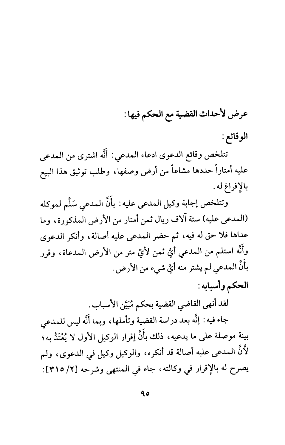 جاء فيه: إنَّه بعد دراسة القضية وتأملها، وبما أَنَّه ليس للمدعي بينة موصلة على ما يدعيه، ذلك بأنَّ إقرار الوكيل الأول لا يُعْتَدُّ به؛ لأَنَّ المدعى عليه أصالة قد أنكره، والوكيل وكيل في الدعوى، ولم يصرح له بالإقرار في وكالته، جاء في المنتهى وشرحه [2/ 315]: