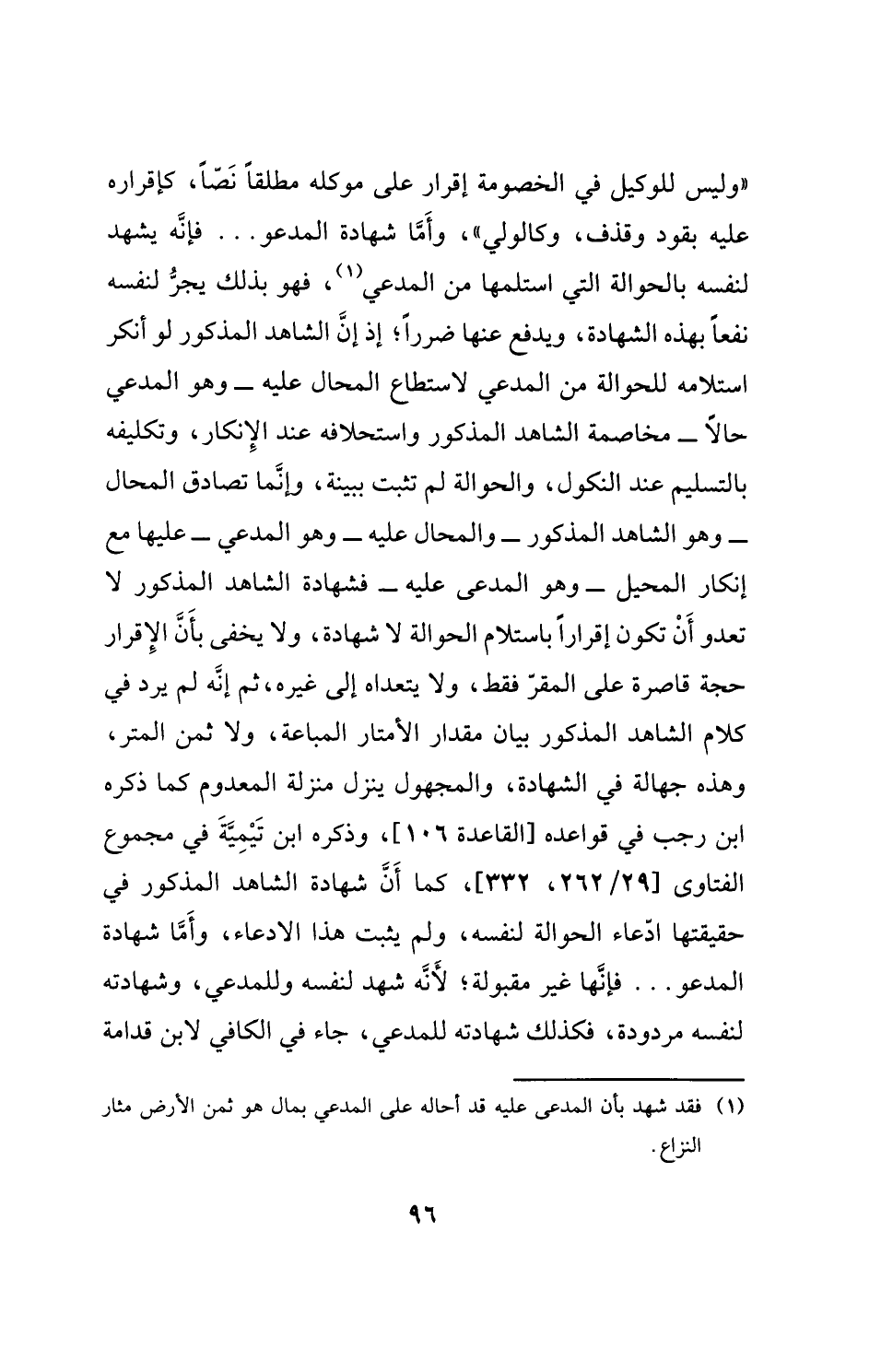 "وليس للوكيل في الخصومة إقرار على موكله مطلقًا نَصًّا، كإقراره عليه بقود وقذف، وكالولي"، وأَمَّا شهادة المدعو ... فإنَّه يشهد لنفسه بالحوالة التي استلمها من المدعي (¬1)، فهو بذلك يجرُّ لنفسه نفعًا بهذه الشهادة، ويدفع عنها ضررًا؛ إذ إنَّ الشاهد المذكور لو أنكر استلامه للحوالة من المدعي لاستطاع المحال عليه -وهو المدعي حالًا- مخاصمة الشاهد المذكور واستحلافه عند الإنكار، وتكليفه بالتسليم عند النكول، والحوالة لم تثبت ببينة، وإنَّما تصادق المحال -وهو الشاهد المذكور- والمحال عليه -وهو المدعي -عليها مع إنكار المحيل -وهو المدعى عليه- فشهادة الشاهد المذكور لا تعدو أَنْ تكون إقرارًا باستلام الحوالة لا شهادة، ولا يخفى بأَنَّ الإقرار حجة قاصرة على المقرّ فقط، ولا يتعداه إلى غيره، ثم إنَّه لم يرد في كلام الشاهد المذكور بيان مقدار الأمتار المباعة، ولا ثمن المتر، وهذه جهالة في الشهادة، والمجهول ينزل منزلة المعدوم كما ذكره ابن رجب في قواعده [القاعدة 106]، وذكره ابن تَيْمِيَّة في مجموع الفتاوى [29/ 262، 332]، كما أنَّ شهادة الشاهد المذكور في حقيقتها ادّعاء الحوالة لنفسه، ولم يثبت هذا الادعاء، وأَمَّا شهادة المدعو ... فإنَّها غير مقبولة؛ لأنَّه شهد لنفسه وللمدعي، وشهادته لنفسه مردودة، فكذلك شهادته للمدعي، جاء في الكافي لابن قدامة