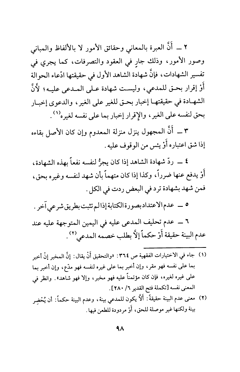 2 - أَنَّ العبرة بالمعاني وحقائق الأمور لا بالألفاظ والمباني وصور الأمور، وذلك جارٍ في العقود والتصرفات، كما يجري في تفسير الشهادات، فإنَّ شهادة الشاهد الأول في حقيقتها ادّعاء الحوالة أَوْ إقرار بحق للمدعي، وليست شهادة على المدعى عليه؛ لأَنَّ الشهادة في حقيقتها إخبار بحق للغير على الغير، والدعوى إخبار بحق لنفسه على الغير، والإقرار إخبار بما على نفسه لغيره (¬1).