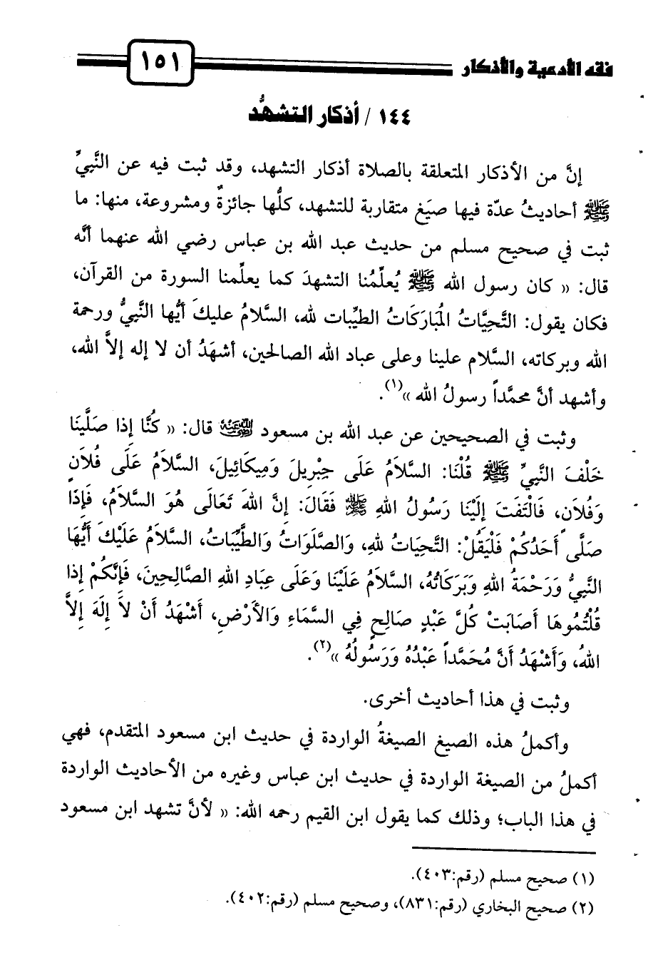 إنَّ من الأذكار المتعلقة بالصلاة أذكار التشهد، وقد ثبت فيه عن النَّبِيِّ صلى الله عليه وسلم أحاديثُ عدّة فيها صيَغ متقاربة للتشهد، كلُّها جائزةٌ ومشروعة، منها: ما ثبت في صحيح مسلم من حديث عبد الله بن عباس رضي الله عنهما أنَّه قال: " كان رسول الله صلى الله عليه وسلم يُعلِّمُنا التشهدَ كما يعلِّمنا السورة من القرآن، فكان يقول: التَّحِيَّاتُ المُبَارَكَاتُ الطيِّبات لله، السَّلامُ عليكَ أيُّها النَّبِيُّ ورحمة الله وبركاته، السَّلام علينا وعلى عباد الله الصالحين، أشهَدُ أن لا إله إلاَّ الله، وأشهد أنَّ محمَّداً رسولُ الله "1.