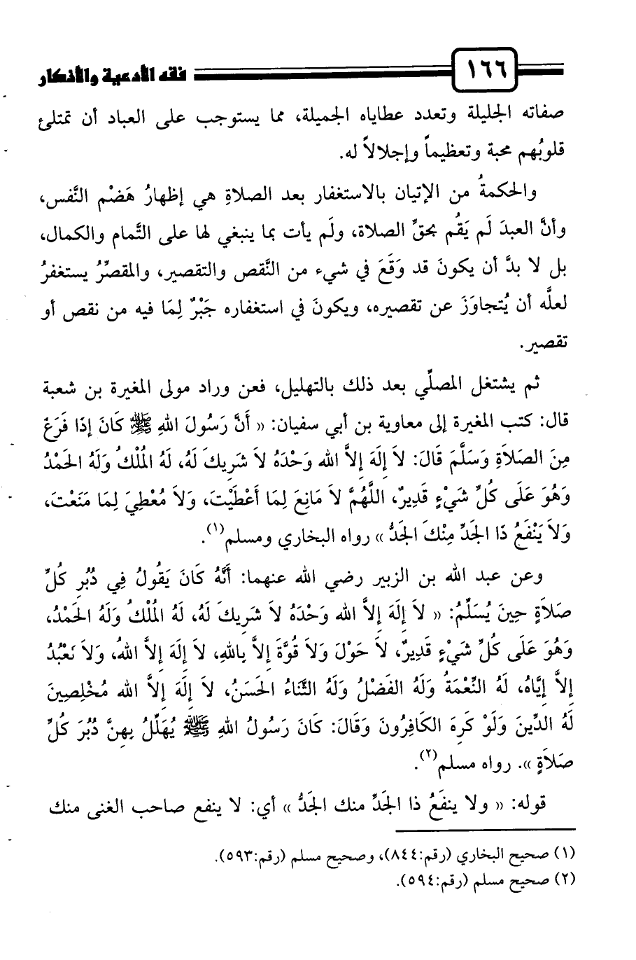ثم يشتغل المصلِّي بعد ذلك بالتهليل، فعن وراد مولى المغيرة بن شعبة قال: كتب المغيرة إلى معاوية بن أبي سفيان: "أَنَّ رَسُولَ اللهِ صلى الله عليه وسلم كَانَ إذَا فَرَغَ مِنَ الصَلاَةِ وَسَلَّمَ قَالَ: لاَ إِلَهَ إِلاَّ الله وَحْدَهُ لاَ شَرِيكَ لَهُ، لَهُ المُلْكُ وَلَهُ الحَمْدُ وَهُوَ عَلَى كُلِّ شَيْءٍ قَدِيرٌ، اللَّهُمَّ لاَ مَانِعَ لِمَا أَعْطَيْتَ، وَلاَ مُعْطِيَ لِمَا مَنَعْتَ، وَلاَ يَنْفَعُ ذَا الجَدِّ مِنْكَ الجَدُّ" رواه البخاري ومسلم1.