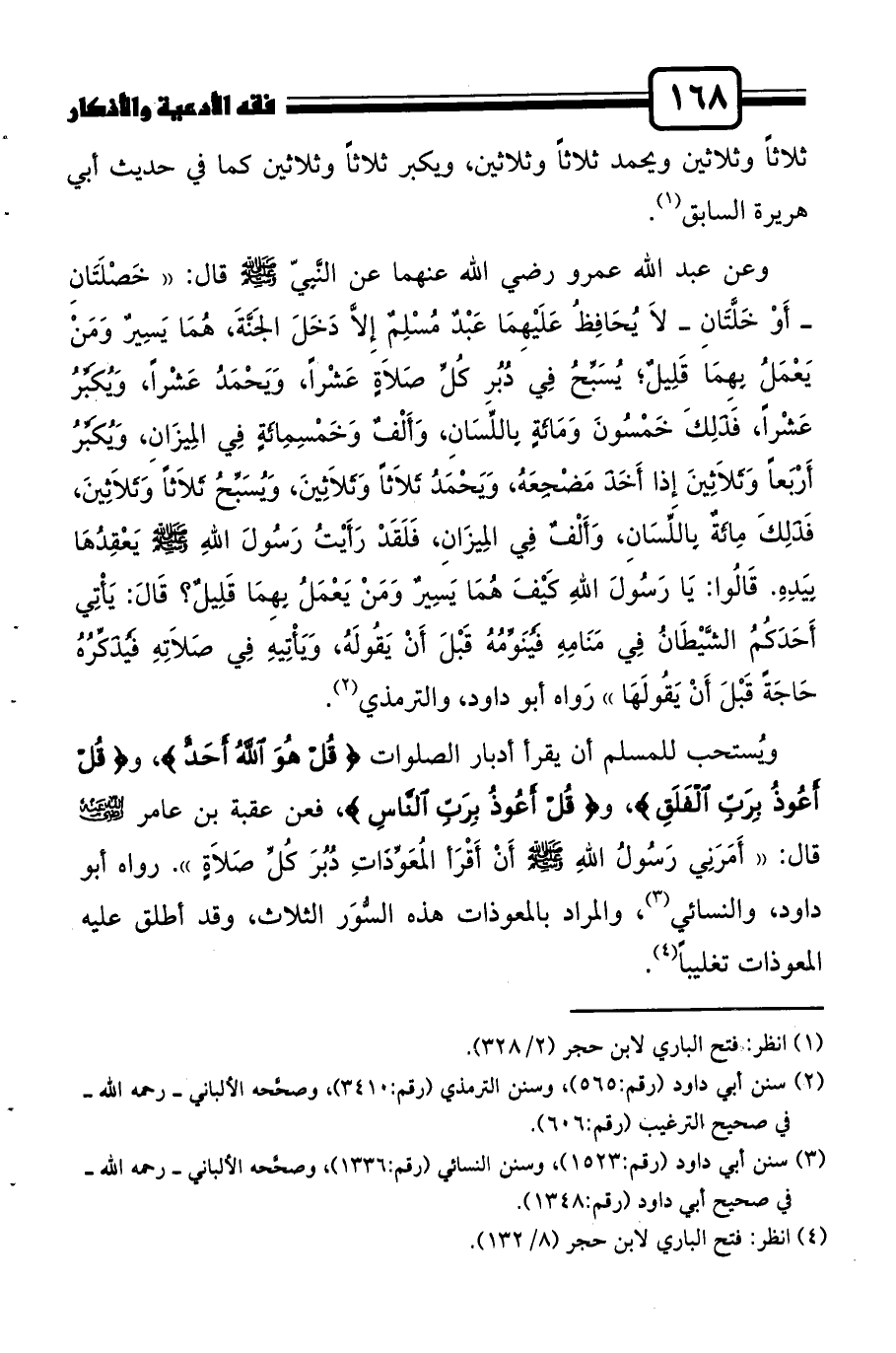 وعن عبد الله عمرو رضي الله عنهما عن النَّبِيّ صلى الله عليه وسلم قال: "خَصْلَتَانِ أَوْ خَلَّتَانِ لاَ يُحَافِظُ عَلَيْهِمَا عَبْدٌ مُسْلِمٌ إِلاَّ دَخَلَ الجَنَّةَ، هُمَا يَسِيرٌ وَمَنْ يَعْمَلُ بِهِمَا قَلِيلٌ؛ يُسَبِّحُ فِي دُبُرِ كُلِّ صَلاَةٍ عَشْراً، وَيَحْمَدُ عَشْراً، وَيُكَبِّرُ عَشْراً، فَذَلِكَ خَمْسُونَ وَمَائَةٍ بِاللِّسَانِ، وَأَلْفٌ وَخَمْسِمِائَةٍ فِي المِيزَانِ، وَيُكَبِّرُ أَرْبَعاً وَثَلاَثِينَ إِذا أَخَذَ مَضْجِعَهُ، وَيَحْمَدُ ثَلاَثاً وَثَلاَثِينَ، وَيُسَبِّحُ ثَلاَثاً وَثَلاَثِينَ، فَذَلِكَ مِائَةٌ بِاللِّسَانِ، وَأَلْفٌ فِي المِيزَانِ، فَلَقَدْ رَأَيْتُ رَسُولَ اللهِ صلى الله عليه وسلم يَعْقِدُهَا بِيَدِهِ. قَالُوا: يَا رَسُولَ اللهِ كَيْفَ هُمَا يَسِيرٌ وَمَنْ يَعْمَلُ بِهِمَا قَلِيلٌ؟ قَالَ: يَأْتِي أَحَدَكُمُ الشَّيْطَانُ فِي مَنَامِهِ فَيُنَوِّمُهُ قَبْلَ أَنْ يَقُولَهُ، وَيَأْتِيهِ فِي صَلاَتِهِ فَيُذَكِّرُهُ حَاجَةً قَبْلَ أَنْ يَقُولَهَا " رَواه أبو داود، والترمذي2.
