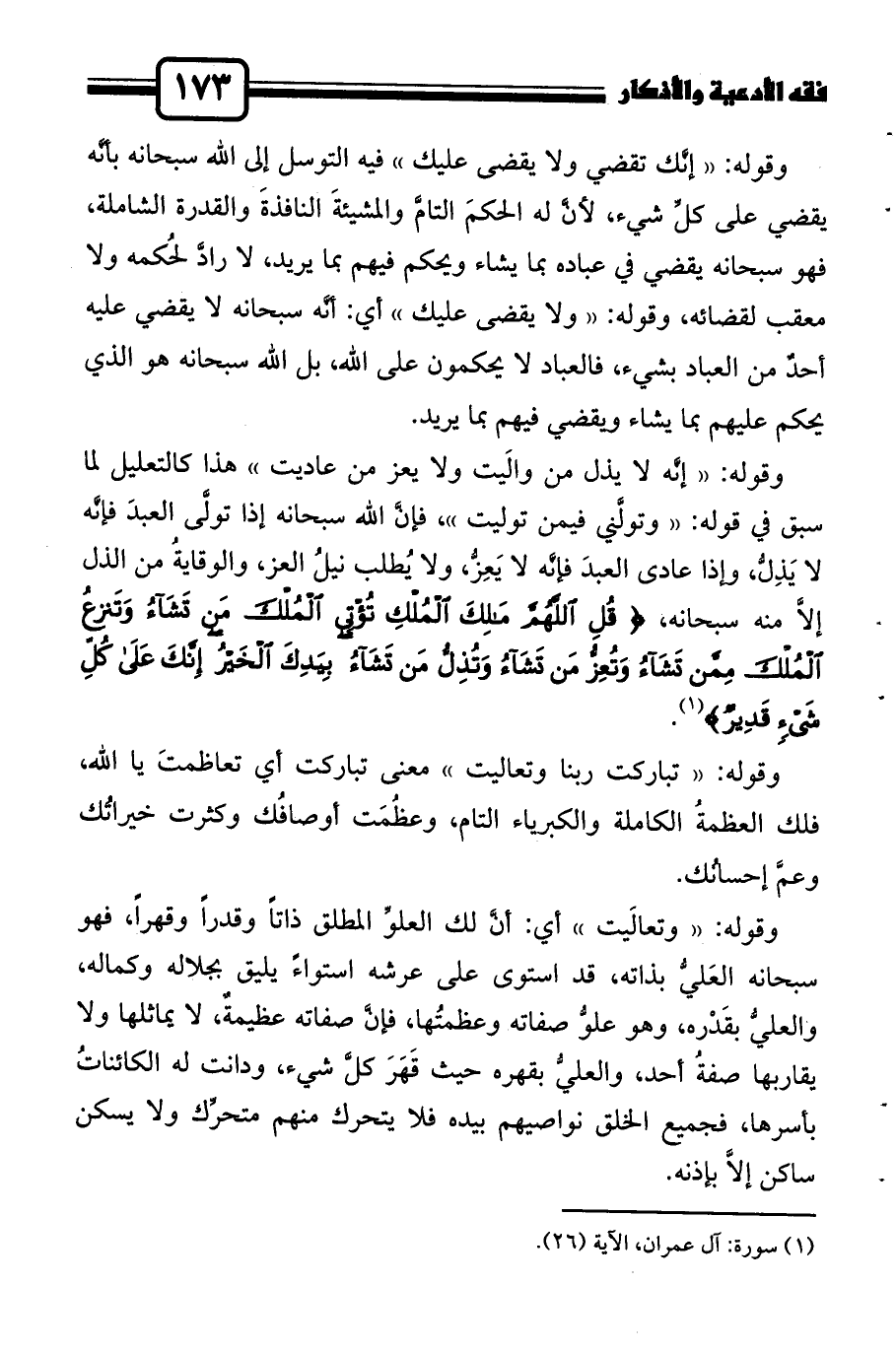 وقوله: "إنَّك تقضي ولا يقضى عليك" فيه التوسل إلى الله سبحانه بأنَّه يقضي على كلِّ شيء، لأنَّ له الحكمَ التامَّ والمشيئةَ النافذةَ والقدرة الشاملة، فهو سبحانه يقضي في عباده بما يشاء ويحكم فيهم بما يريد، لا رادَّ لحُكمه ولا معقب لقضائه، وقوله: "ولا يقضى عليك" أي: أنَّه سبحانه لا يقضي عليه أحدٌ من العباد بشيء، فالعباد لا يحكمون على الله، بل الله سبحانه هو الذي يحكم عليهم بما يشاء ويقضي فيهم بما يريد.