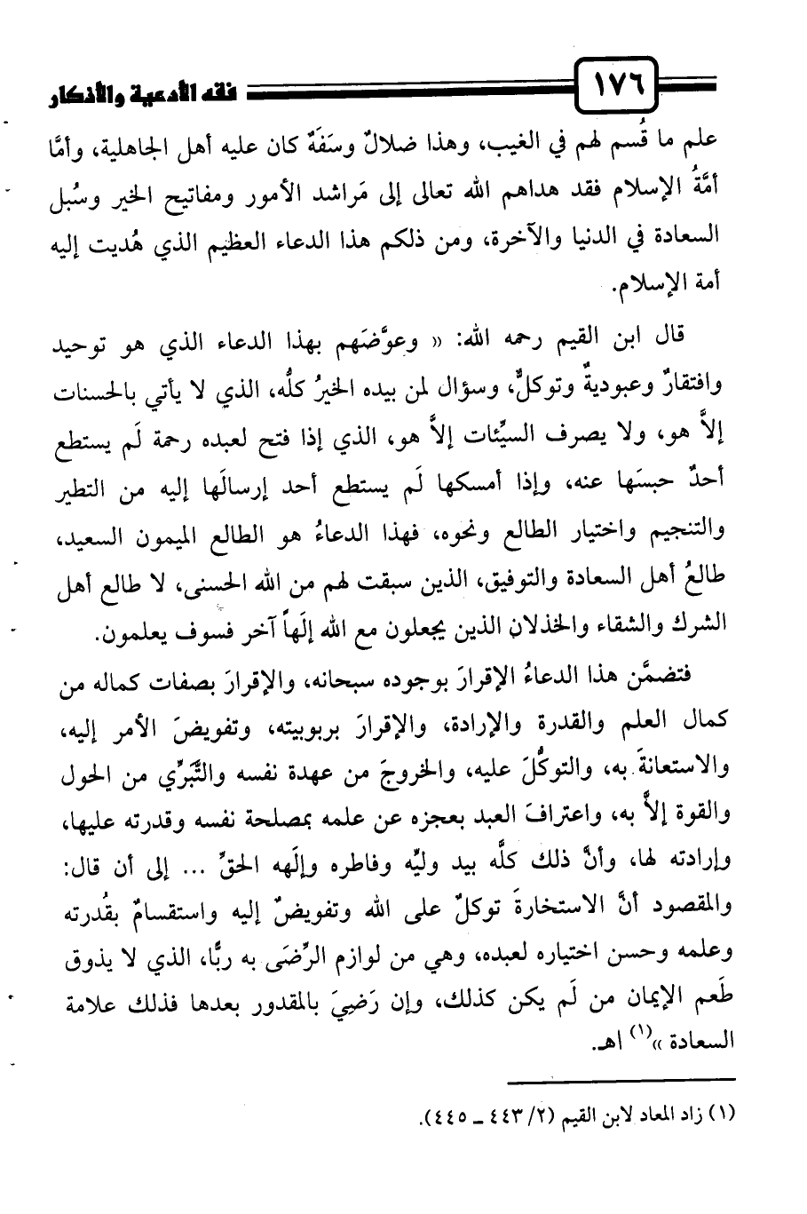 قال ابن القيم رحمه الله: "وعوَّضَهم بهذا الدعاء الذي هو توحيد وافتقارٌ وعبوديةٌ وتوكلٌّ، وسؤال لمن بيده الخيرُ كلُّه، الذي لا يأتي بالحسنات إلاَّ هو، ولا يصرف السيِّئات إلاَّ هو، الذي إذا فتح لعبده رحمة لَم يستطع أحدٌ حبسَها عنه، وإذا أمسكها لَم يستطع أحد إرسالَها إليه من التطير والتنجيم واختيار الطالع ونحوه، فهذا الدعاءُ هو الطالع الميمون السعيد، طالعُ أهل السعادة والتوفيق، الذين سبقت لهم من الله الحسنى، لا طالع أهل الشرك والشقاء والخذلان الذين يجعلون مع الله إلَهاً آخر فسوف يعلمون.