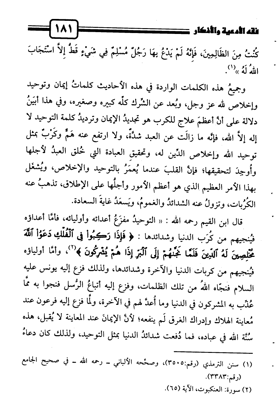 كُنْتُ مِنَ الظَالِمِينَ، فَإِنَّهُ لَمْ يَدْعُ بِهَا رَجُلٌ مُسْلِمٌ فِي شَيْءٍ قَطُّ إِلاَّ اسْتَجَابَ اللهُ لَهُ"1.
