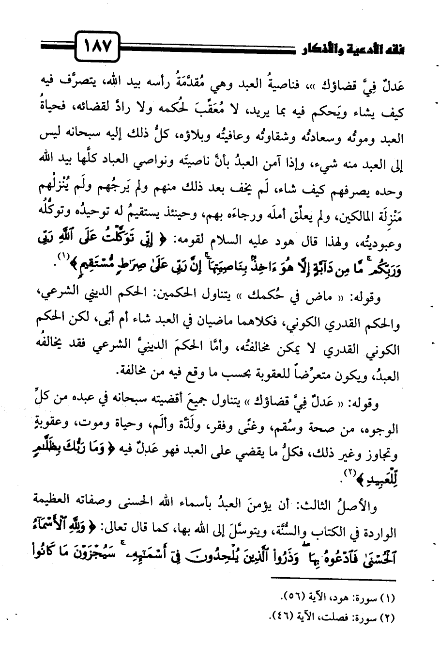 عَدلٌ فِيَّ قضاؤك"، فناصيةُ العبد وهي مُقدَّمَةُ رأسه بيد الله، يتصرَّف فيه كيف يشاء ويَحكم فيه بما يريد، لا مُعَقِّبَ لحُكمه ولا رادَّ لقضائه، فحياةُ العبد وموتُه وسعادتُه وشقاوتُه وعافيتُه وبلاؤه، كلُّ ذلك إليه سبحانه ليس إلى العبد منه شيء، وإذا آمن العبدُ بأنَّ ناصيتَه ونواصي العباد كلَّها بيد الله وحده يصرفهم كيف شاء، لَم يخف بعد ذلك منهم ولم يَرجُهم ولَم يُنْزلْهم مَنْزِلَة المالكين، ولم يعلِّق أملَه ورجاءَه بهم، وحينئذ يستقيمُ له توحيدُه وتوكُّلُه وعبوديتُه، ولهذا قال هود عليه السلام لقومه: {إِنِّي تَوَكَّلْتُ عَلَى اللَّهِ رَبِّي وَرَبِّكُمْ مَا مِنْ دَابَّةٍ إِلاَّ هُوَ آخِذٌ بِنَاصِيَتِهَا إِنَّ رَبِّي عَلَى صِرَاطٍ مُسْتَقِيمٍ} 1.