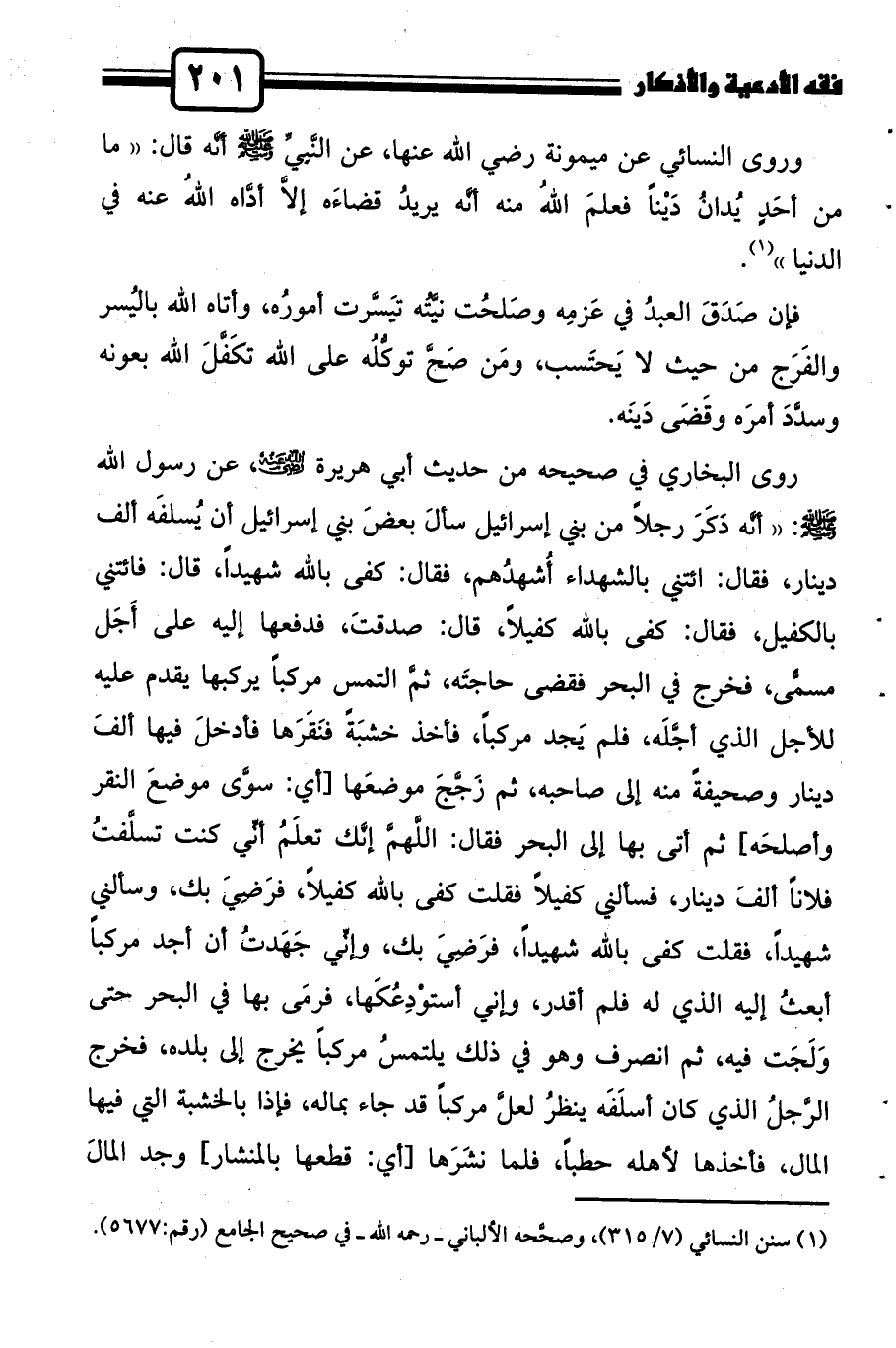 روى البخاري في صحيحه من حديث أبي هريرة رضي الله عنه، عن رسول الله صلى الله عليه وسلم: "أنَّه ذَكَرَ رجلاً من بني إسرائيل سألَ بعضَ بني إسرائيل أن يُسلفَه ألف دينار، فقال: ائتني بالشهداء أُشهدُهم، فقال: كفى بالله شهيداً، قال: فائتني بالكفيل، فقال: كفى بالله كفيلاً، قال: صدقتَ، فدفعها إليه على أَجَل مسمًّى، فخرج في البحر فقضى حاجتَه، ثمَّ التمس مركباً يركبها يقدم عليه للأجل الذي أجَّلَه، فلم يَجد مركباً، فأخذ خشبَةً فنَقَرَها فأدخلَ فيها ألفَ دينار وصحيفةً منه إلى صاحبه، ثم زَجَّجَ موضعَها [أي: سوَّى موضعَ النقر وأصلحَه] ثم أتى بها إلى البحر فقال: اللَّهمَّ إنَّك تعلَمُ أنِّي كنت تسلَّفتُ فلاناً ألفَ دينار، فسألني كفيلاً فقلت كفى بالله كفيلاً، فرَضِيَ بك، وسألني شهيداً، فقلت كفى بالله شهيداً، فرَضِيَ بك، وإنِّي جَهَدتُ أن أجد مركباً أبعثُ إليه الذي له فلم أقدر، وإني أستوْدِعُكَها، فرمَى بها في البحر حتى وَلَجَت فيه، ثم انصرف وهو في ذلك يلتمسُ مركباً يخرج إلى بلده، فخرج الرَّجلُ الذي كان أسلَفَه ينظرُ لعلَّ مركباً قد جاء بماله، فإذا بالخشبة التي فيها المال، فأخذها لأهله حطباً، فلما نشَرَها [أي: قطعها بالمنشار] وجد المالَ