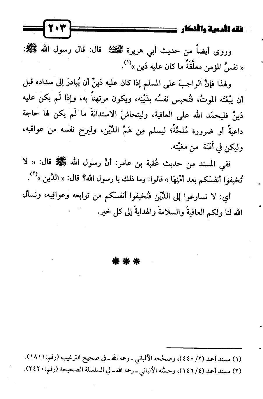 ففي المسند من حديث عُقبة بن عامر: أنَّ رسول الله صلى الله عليه وسلم قال: "لا تُخيفوا أنفسَكم بعد أمْنِهَا" قالوا: وما ذلك يا رسول الله قال: "الدَّين"2.
