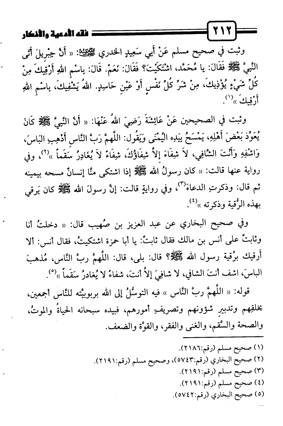 وفي صحيح البخاري عن عبد العزيز بن صُهيب قال: "دخلتُ أنا وثابتٌ على أنس بن مالك فقال ثابتٌ: يا أبا حمزة اشتكيتُ، فقال أنس: ألا أَرقيك برُقية رسول الله صلى الله عليه وسلم قال: بلى، قال: اللَّهمَّ ربَّ النَّاس، مُذهبَ الباسَ، اشف أنتَ الشافي، لا شافِيَ إلاَّ أنتَ، شفاءً لا يُغادرُ سَقَماً"5.
