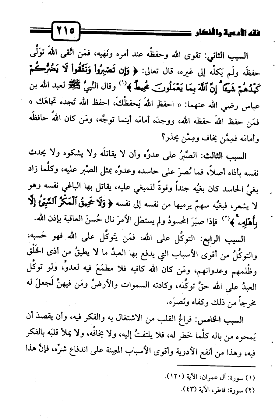 السبب الثاني: تقوى الله وحفظُه عند أمره ونَهيه، فمَن اتَّقى اللهَ توَلَّى حفظَه ولَم يَكلْه إلى غيره، قال تعالى: {وَإِنْ تَصْبِرُوا وَتَتَّقُوا لا يَضُرُّكُمْ كَيْدُهُمْ شَيْئاً إِنَّ اللَّهَ بِمَا يَعْمَلُونَ مُحِيطٌ} 1 وقال النَّبِيُّ صلى الله عليه وسلم لعبد الله بن عباس رضي الله عنهما: "احفظِ اللهَ يَحفظْكَ، احفظ الله تَجده تجاهَك" فمَن حفظ اللهَ حفظه الله، ووجدَه أمامَه أينما توجَّه، ومَن كان اللهُ حافظَه وأمامَه فمِمَّن يخاف ومِمَّن يحذر