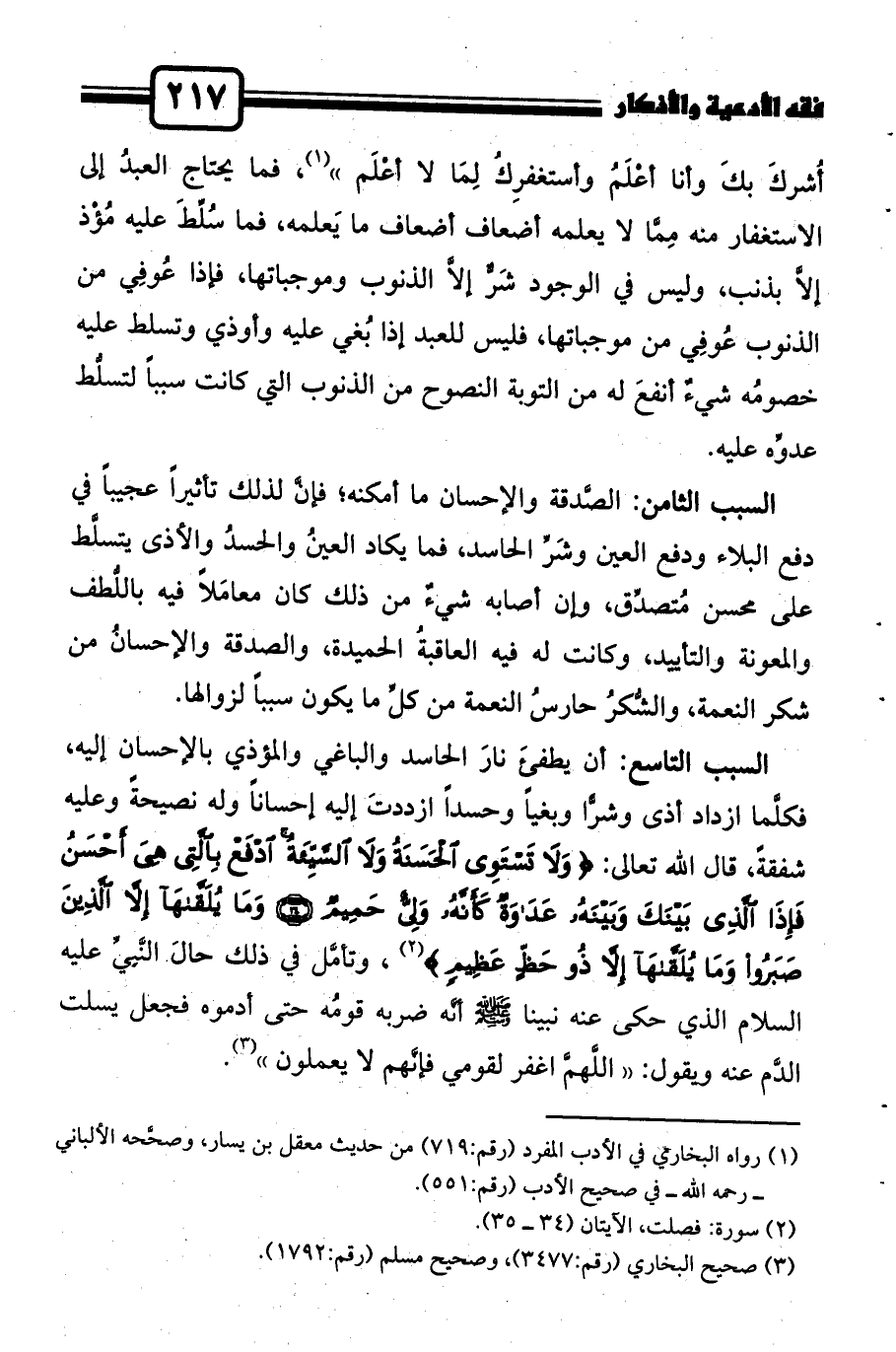 السبب التاسع: أن يطفئَ نارَ الحاسد والباغي والمؤذي بالإحسان إليه، فكلَّما ازداد أذى وشرًّا وبغياً وحسداً ازددتَ إليه إحساناً وله نصيحةً وعليه شفقةً، قال الله تعالى: {وَلا تَسْتَوِي الْحَسَنَةُ وَلا السَّيِّئَةُ ادْفَعْ بِالَّتِي هِيَ أَحْسَنُ فَإِذَا الَّذِي بَيْنَكَ وَبَيْنَهُ عَدَاوَةٌ كَأَنَّهُ وَلِيٌّ حَمِيمٌ وَمَا يُلَقَّاهَا إِلاَّ الَّذِينَ صَبَرُوا وَمَا يُلَقَّاهَا إِلَّا ذُو حَظٍّ عَظِيمٍ} 2، وتأمَّل في ذلك حالَ النَّبِيِّ عليه السلام الذي حكى عنه نبينا صلى الله عليه وسلم أنَّه ضربه قومُه حتى أدموه فجعل يسلت الدَّم عنه ويقول: " اللَّهمَّ اغفر لقومي فإنَّهم لا يعملون "3.