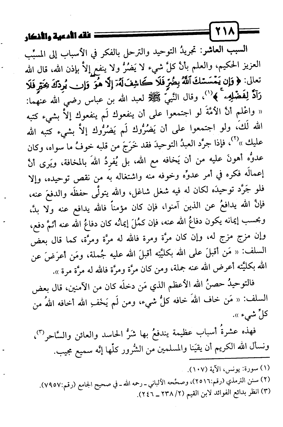 فهذه عشرةُ أسباب عظيمة يندفعُ بها شَرُّ الحاسد والعائن والسَّاحر3، ونسأل الله الكريم أن يقيَنا والمسلمين من الشُّرور كلِّها إنَّه سميع مجيب.