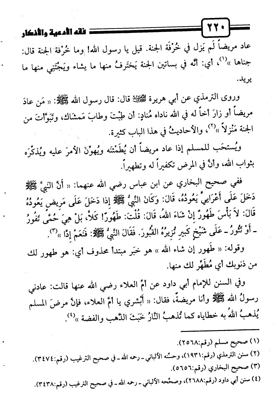 ففي صحيح البخاري عن ابن عباس رضي الله عنهما: " أَنَّ النَبيَّ صلى الله عليه وسلم دَخَلَ عَلَى أَعْرَابِيٍّ يَعُودُهُ، قَالَ: وَكَانَ النَّبيُّ صلى الله عليه وسلم إِذا دَخَلَ عَلَى مَرِيضٍ يَعُودُهُ قَالَ: لاَ بَأْسَ طَهُورٌ إِنْ شَاءَ اللهُ، قَالَ: قُلْتَ: طَهُورٌ! كَلاَّ، بَلْ هِيَ حُمَّى تَفُورُ أَوْ تَثُورُ عَلَى شَيْخٍ كَبيرِ تُزِيرُهُ القُبُورَ. فَقَالَ النَّبيُّ صلى الله عليه وسلم: فَنَعَمْ إِذًا "3.