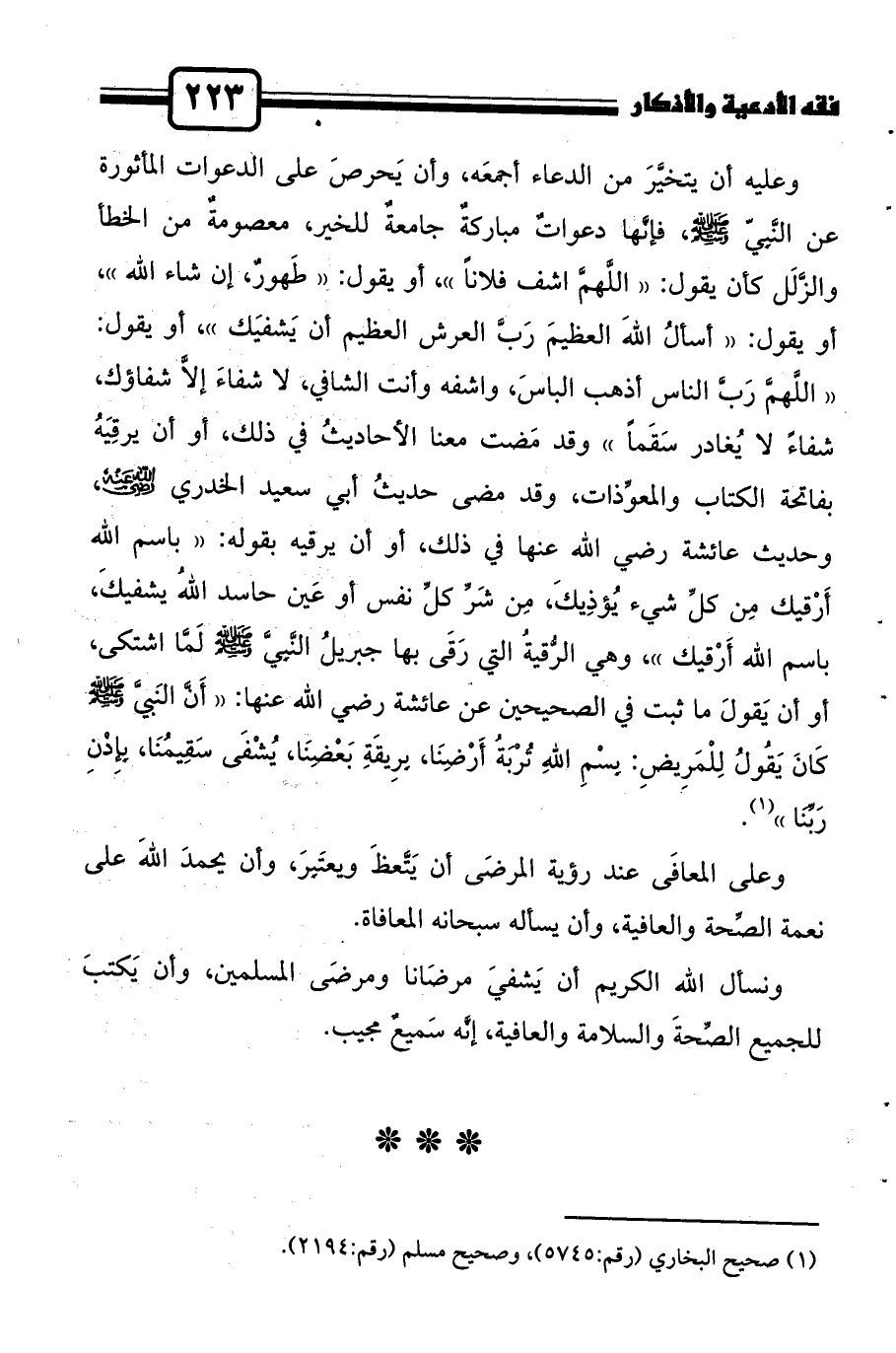 وعليه أن يتخيَّرَ من الدعاء أجمعَه، وأن يَحرصَ على الدعوات المأثورة عن النَّبِيّ صلى الله عليه وسلم، فإنَّها دعواتٌ مباركةٌ جامعةٌ للخير، معصومةٌ من الخطأ والزَّلَل كأن يقول: "اللَّهمَّ اشف فلاناً"، أو يقول: "طَهورٌ، إن شاء الله"، أو يقول: "أسألُ اللهَ العظيمَ رَبَّ العرش العظيم أن يَشفيَك"، أو يقول: "اللَّهمَّ رَبَّ الناس أذهب الباسَ، واشفه وأنت الشافي، لا شفاءَ إلاَّ شفاؤك، شفاءً لا يُغادر سَقَماً" وقد مَضت معنا الأحاديثُ في ذلك، أو أن يرقِيَهُ بفاتحة الكتاب والمعوِّذات، وقد مضى حديثُ أبي سعيد الخدري رضي الله عنه، وحديث عائشة رضي الله عنها في ذلك، أو أن يرقيه بقوله: "باسم الله أَرْقيك مِن كلِّ شيء يُؤذِيكَ، مِن شَرِّ كلِّ نفس أو عَين حاسد اللهُ يشفيكَ، باسم الله أَرْقيك"، وهي الرُّقيةُ التي رَقَى بها جبريلُ النَّبِيَّ صلى الله عليه وسلم لَمَّا اشتكى، أو أن يَقولَ ما ثبت في الصحيحين عن عائشة رضي الله عنها: "أَنَّ النَبيَّ صلى الله عليه وسلم كَانَ يَقُولُ لِلْمَرِيضِ: بِسْمِ اللهِ تُرْبَةُ أَرْضِنَا، بِرِيقَةِ بَعْضِنَا، يُشْفَى سَقِيمُنَا، بِإِذْنِ رَبِّنَا" 1.