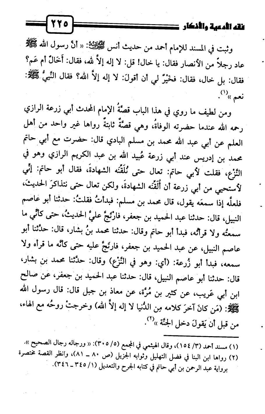 ومن لطيف ما روي في هذا الباب قصَّةُ الإمام المحدث أبي زرعة الرازي رحمه الله عندما حضرته الوفاةُ، وهي قصَّةٌ ثابتةٌ رواها غير واحد من أهل العلم عن أبي عبد الله محمد بن مسلم البادي قال: حضرت مع أبي حاتم محمد بن إدريس عند أبي زرعة عُبيد الله بن عبد الكريم الرازي وهو في النَّزْع، فقلت لأبي حاتم: تعال حتى نُلَقِّنَه الشهادةَ، فقال أبو حاتم: إنِّي لأستحيي من أبي زرعة أن أُلَقِّنَه الشهادةَ، ولكن تعال حتى نتذاكرَ الحديثَ، فلعلَّه إذا سمعَه يقول، قال محمد بن مسلم: فبدأتُ فقلتُ: حدثنا أبو عاصم النبيل، قال: حدثنا عبد الحميد بن جعفر، فارْتَجَّ عليَّ الحديثُ، حتى كأنِّي ما سمعتُه ولا قرأتُه، فبدأ أبو حاتم وقال: حدثنا محمد بنُ بشار، قال: حدَّثنا أبو عاصم النبيل، عن عبد الحميد بن جعفر، فارتَجَّ عليه حتى كأنَّه ما قرأه ولا سمعه، فبدأ أبو زُرعة: (أي: وهو في النَّزْع) وقال: حدَّثنا محمد بن بشار، قال: حدثنا أبو عاصم النبيل، قال: حدثنا عبد الحميد بن جعفر، عن صالح ابن أبي عَريب، عن كثير بن مُرَّة، عن معاذ بن جبل قال: قال رسول الله صلى الله عليه وسلم: "مَن كانَ آخرَ كلامه مِن الدُّنيا لا إله إلاَّ الله" وخرجتْ روحُه مع الهاء، من قبل أن يَقولَ دخل الجنَّة"2.