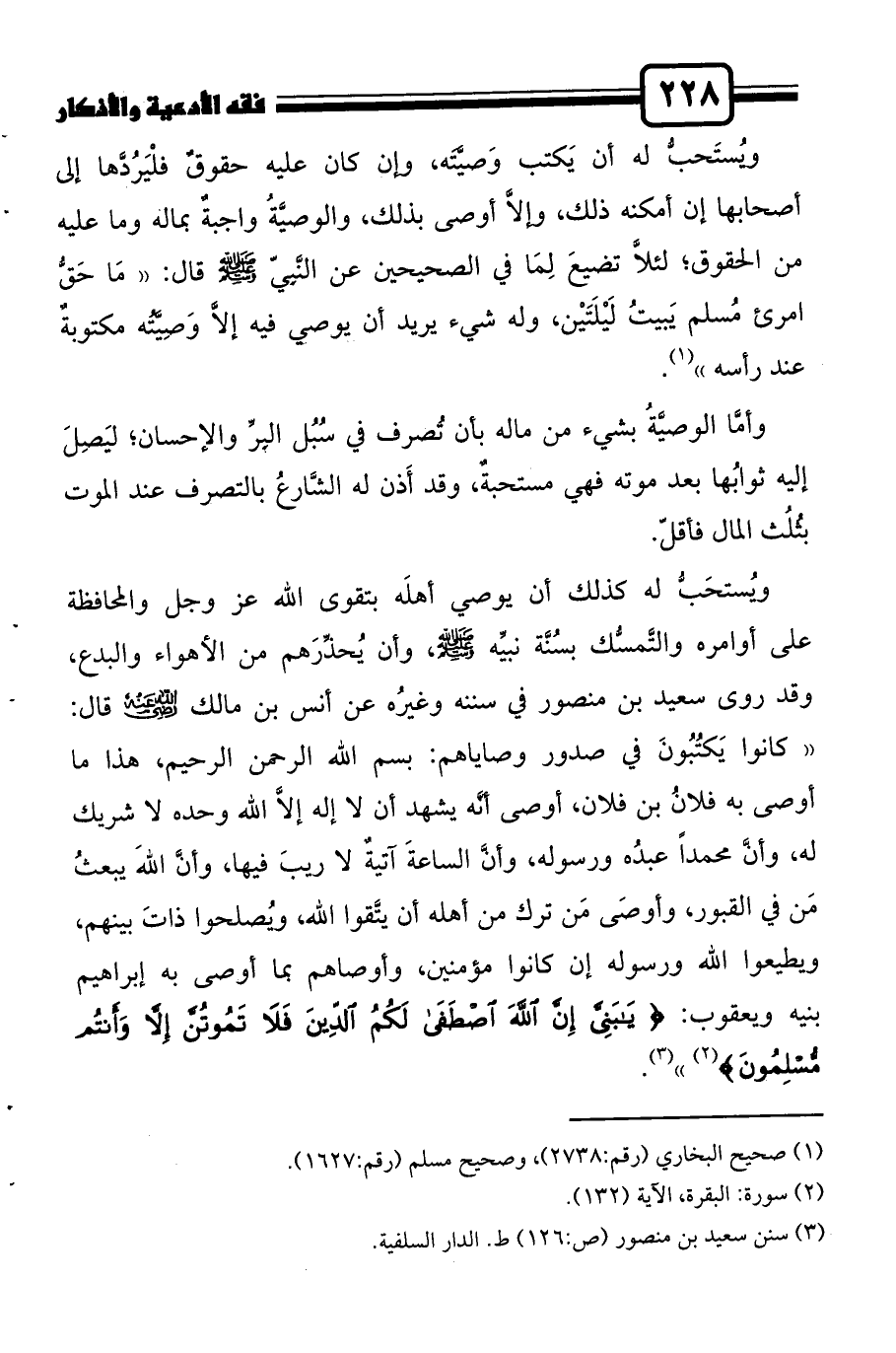 ويُستحَبُّ له كذلك أن يوصي أهلَه بتقوى الله عز وجل والمحافظة على أوامره والتَّمسُّك بسُنَّة نبيِّه صلى الله عليه وسلم، وأن يُحذِّرَهم من الأهواء والبدع، وقد روى سعيد بن منصور في سننه وغيرُه عن أنس بن مالك رضي الله عنه قال: "كانوا يَكتُبُونَ في صدور وصاياهم: بسم الله الرحمن الرحيم، هذا ما أوصى به فلانُ بن فلان، أوصى أنَّه يشهد أن لا إله إلاَّ الله وحده لا شريك له، وأنَّ محمداً عبدُه ورسوله، وأنَّ الساعةَ آتيةٌ لا ريبَ فيها، وأنَّ اللهَ يبعثُ مَن في القبور، وأوصَى مَن ترك من أهله أن يتَّقوا الله، ويُصلحوا ذاتَ بينهم، ويطيعوا الله ورسوله إن كانوا مؤمنين، وأوصاهم بما أوصى به إبراهيم بنيه ويعقوب: {يَا بَنِيَّ إِنَّ اللَّهَ اصْطَفَى لَكُمُ الدِّينَ فَلا تَمُوتُنَّ إِلاَّ وَأَنْتُمْ مُسْلِمُونَ} (2 ") 3.