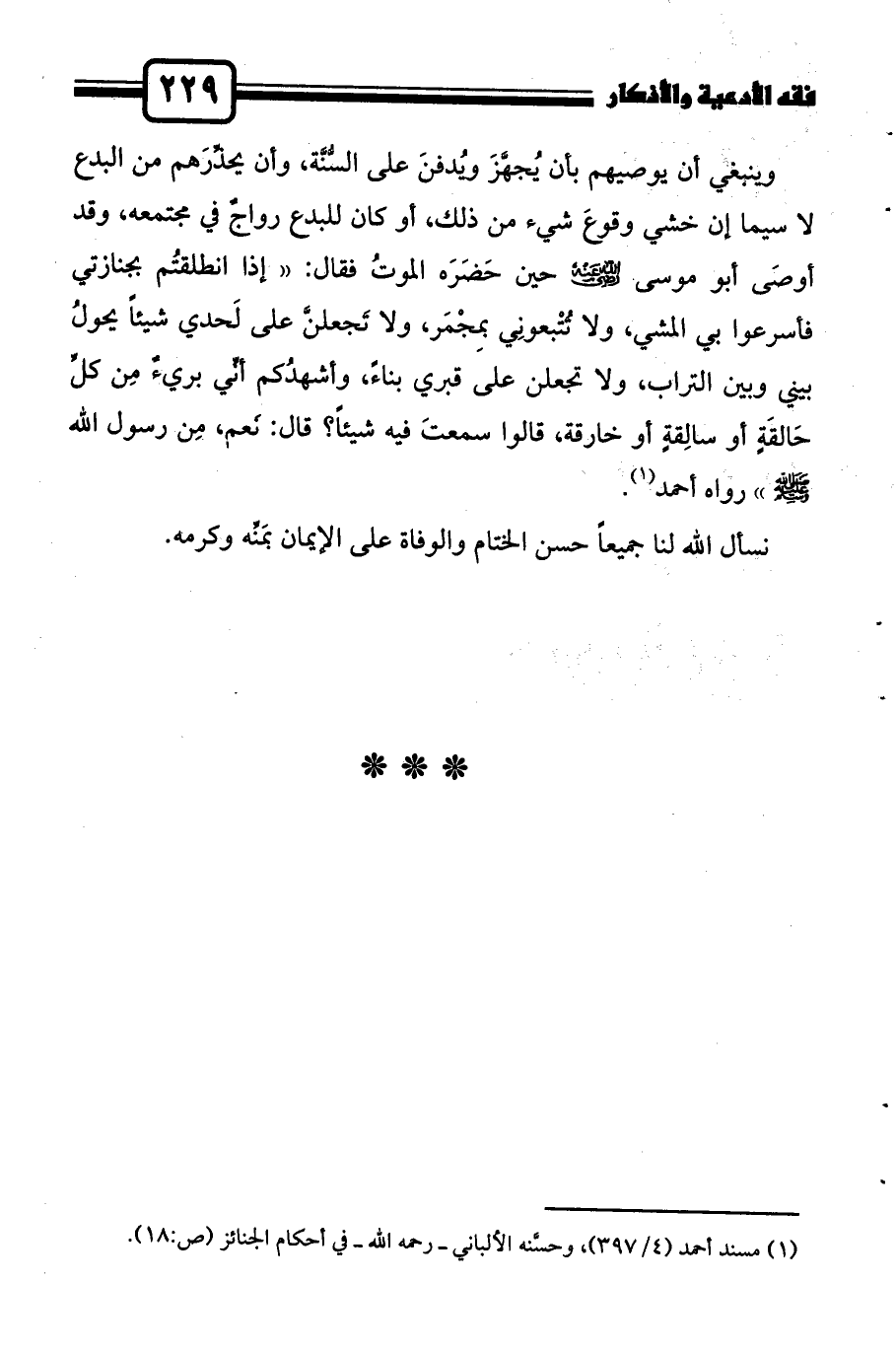 وينبغي أن يوصيهم بأن يُجهَّزَ ويُدفنَ على السُّنَّة، وأن يحذِّرَهم من البدع لا سيما إن خشي وقوعَ شيء من ذلك، أو كان للبدع رواجٌ في مجتمعه، وقد أوصَى أبو موسى رضي الله عنه حين حَضَرَه الموتُ فقال: "إذا انطلقتُم بجنازتي فأسرعوا بي المشي، ولا تُتْبعونِي بمِجْمَر، ولا تَجعلنَّ على لَحدي شيئاً يحولُ بيني وبين التراب، ولا تجعلن على قبري بناءً، وأشهدُكم أنِّي بريءٌ مِن كلِّ حَالقَةٍ أو سالِقةٍ أو خارقة، قالوا سمعتَ فيه شيئاً قال: نَعم، مِن رسول الله صلى الله عليه وسلم" رواه أحمد1.