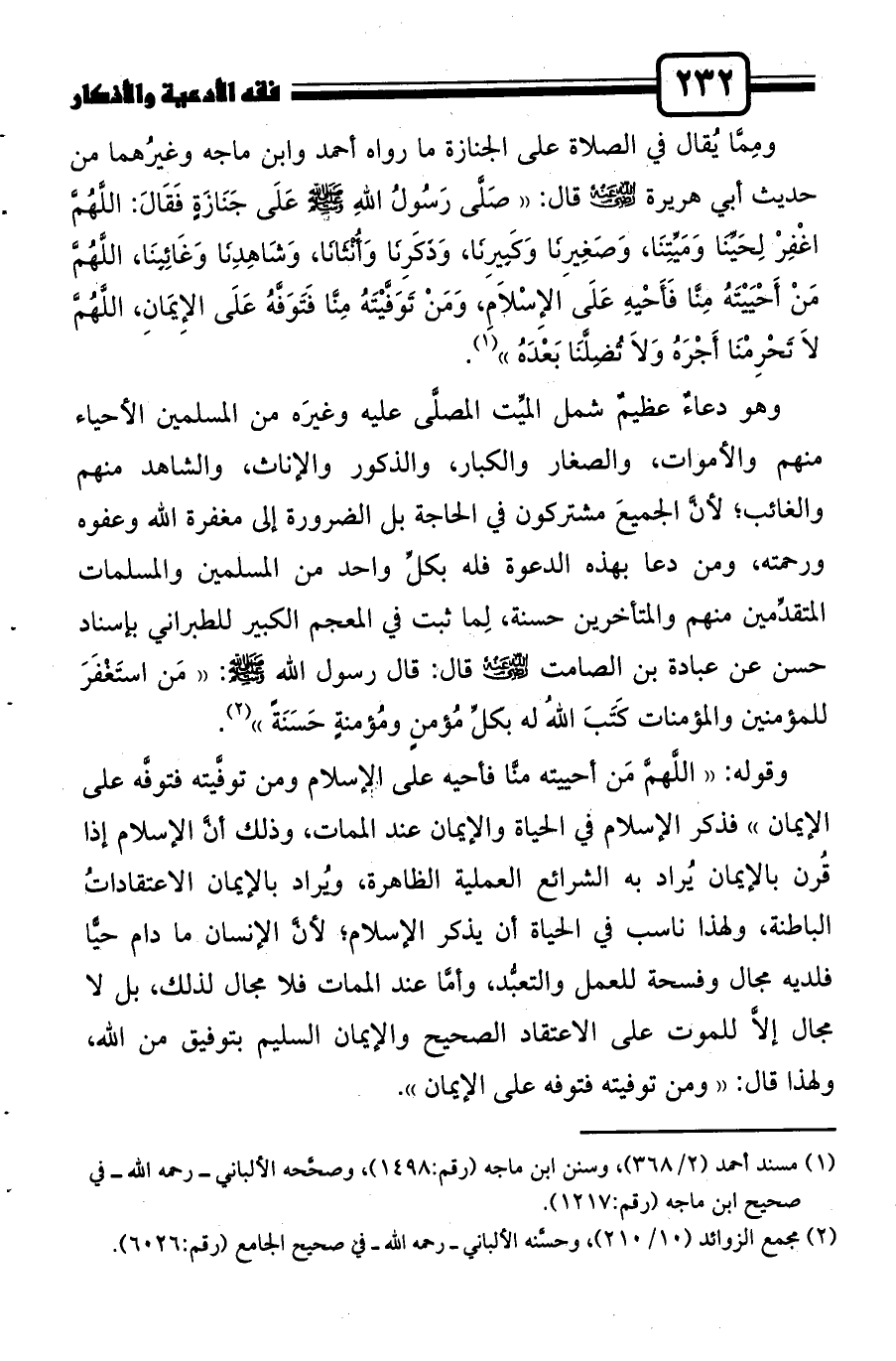 ومِمَّا يُقال في الصلاة على الجنازة ما رواه أحمد وابن ماجه وغيرُهما من حديث أبي هريرة رضي الله عنه قال: "صَلَّى رَسُولُ اللهِ صلى الله عليه وسلم عَلَى جَنَازَةٍ فَقَالَ: اللَّهُمَّ اغْفِرْ لِحَيِّنَا وَمَيِّتِنَا، وَصَغِيرِنَا وَكَبِيرِنَا، وَذَكَرِنَا وَأُنْثَانَا، وَشَاهِدِنَا وَغَائِبِنَا، اللَّهُمَّ مَنْ أَحْيَيْتَهُ مِنَّا فَأَحْيِهِ عَلَى الإِسْلاَمِ، وَمَنْ تَوَفَّيْتَهُ مِنَّا فَتَوَفَّهُ عَلَى الإِيمَانِ، اللَّهُمَّ لاَ تَحْرِمْنَا أَجْرَهُ وَلاَ تُضِلَّنَا بَعْدَهُ"1.