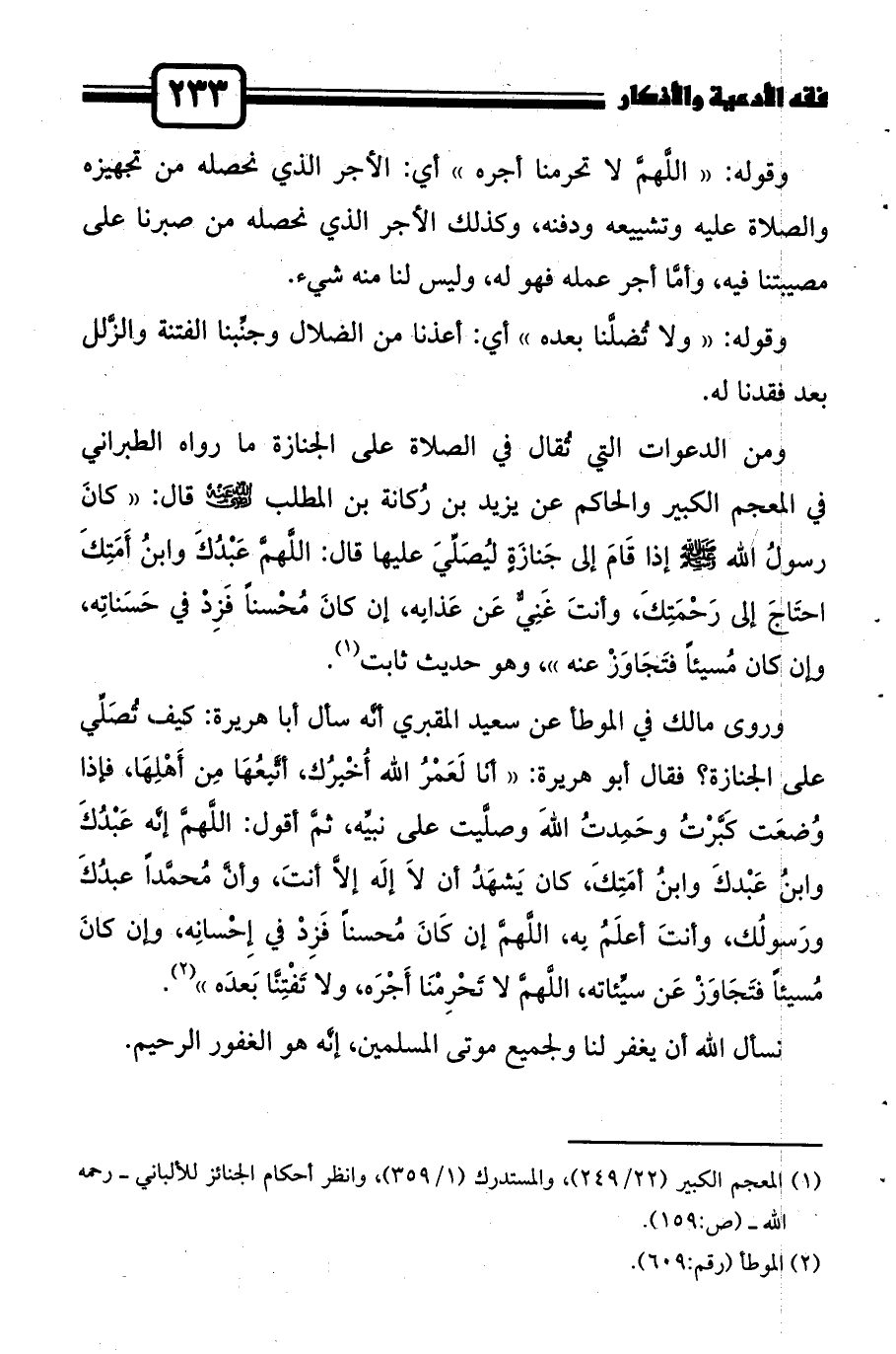 وروى مالك في الموطأ عن سعيد المقبري أنَّه سأل أبا هريرة: كيف تُصَلِّي على الجنازة فقال أبو هريرة: "أنَا لَعَمْرُ الله أُخْبِرُك، أتَّبِعُهَا مِن أَهْلِهَا، فإذا وُضعَت كَبَّرْتُ وحَمِدتُ اللهَ وصلَّيت على نبيِّه، ثمَّ أقول: اللَّهمَّ إنَّه عَبْدُكَ وابنُ عَبْدكَ وابنُ أمَتِكَ، كان يَشهَدُ أن لاَ إلَه إلاَّ أنتَ، وأنَّ مُحمَّداً عبدُكَ ورَسولُك، وأنتَ أعلَمُ بِه، اللَّهمَّ إن كَانَ مُحسناً فَزِدْ في إِحْسانِه، وإن كانَ مُسيئاً فتَجَاوَزْ عَن سيِّئاته، اللَّهمَّ لا تَحْرِمْنَا أَجْرَه، ولا تَفْتِنَّا بَعدَه"2.