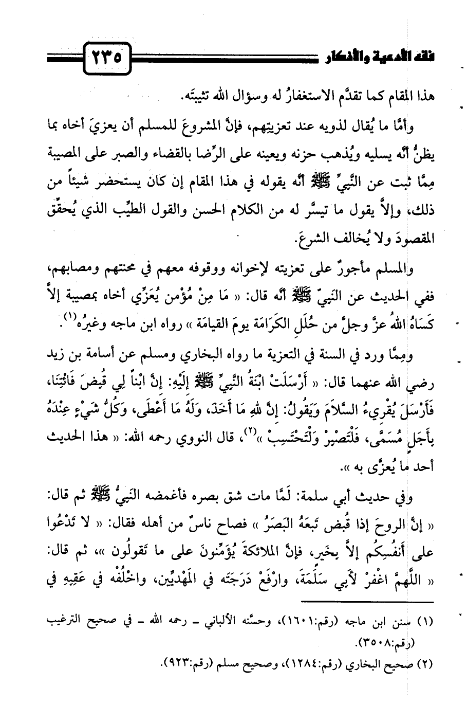 ومِمَّا ورد في السنة في التعزية ما رواه البخاري ومسلم عن أسامة بن زيد رضي الله عنهما قال: " أَرْسَلَتْ ابْنَةُ النَّبِيِّ صلى الله عليه وسلم إِلَيْهِ: إِنَّ ابْناً لِي قُبِضَ فَائْتِنَا، فَأَرْسَلَ يُقْرِيءُ السَّلاَمَ وَيَقُولُ: إِنَّ للهِ مَا أَخَذَ، وَلَهُ مَا أَعْطَى، وَكُلُّ شَيْءٍ عِنْدَهُ بِأَجَلٍ مُسَمَّى، فَلْتَصْبِرْ وَلْتَحْتَسِبْ"2، قال النووي رحمه الله: "هذا الحديث أحد ما يُعزَّى به".