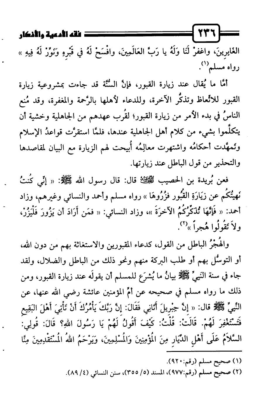 فعن بُريدة بن الحصيب رضي الله عنه قال: قال رسول الله صلى الله عليه وسلم: "إنِّي كُنتُ نَهيتُكُم عن زيَارَةِ القُبُور فزُرُوهَا" رواه مسلم وأحمد والنسائي وغيرهم، وزاد أحمد: "فَإنَّهَا تُذَكِّرُكُمُ الآخرَةَ "، وزاد النسائي: "فمَن أَرَادَ أن يَزُورَ فَلْيَزُرْ، ولاَ تَقُولُوا هُجراً"2.