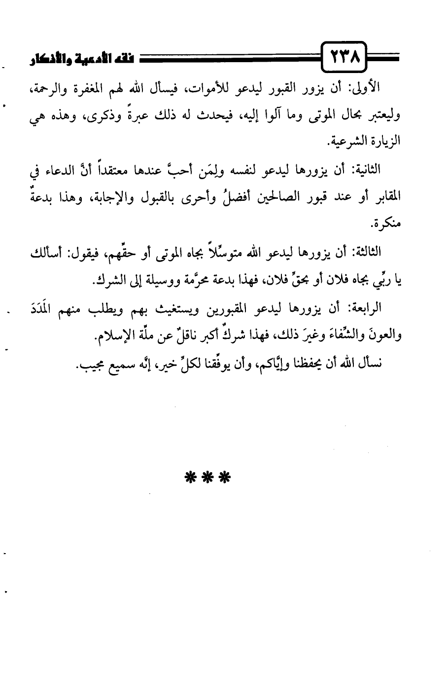 الرابعة: أن يزورها ليدعو المقبورين ويستغيث بهم ويطلب منهم المَدَدَ والعونَ والشِّفاءَ وغيرَ ذلك، فهذا شركٌ أكبر ناقلٌ عن ملِّة الإسلام.