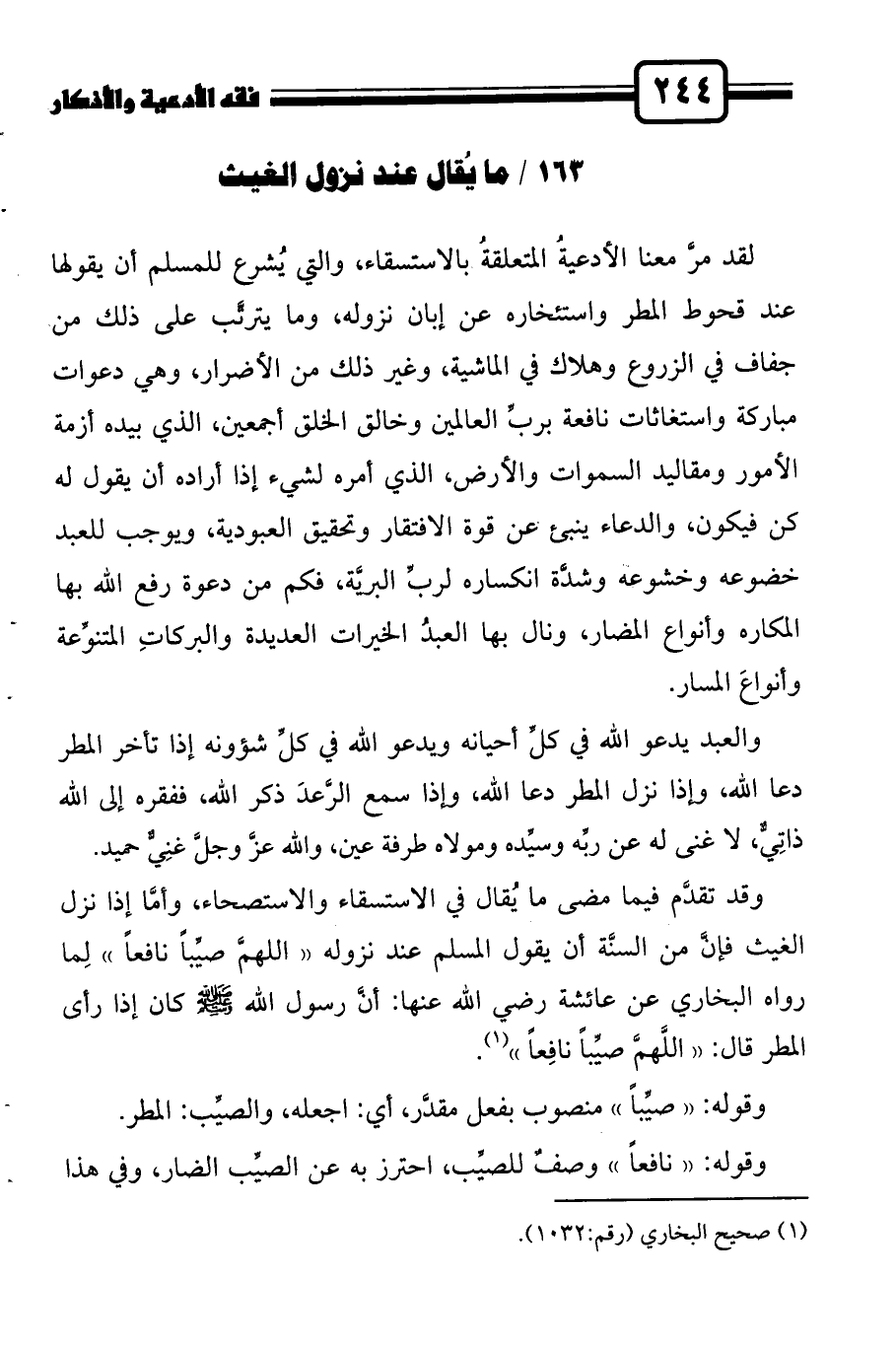 وقد تقدَّم فيما مضى ما يُقال في الاستسقاء والاستصحاء، وأمَّا إذا نزل الغيث فإنَّ من السنَّة أن يقول المسلم عند نزوله "اللهمَّ صيِّباً نافعاً" لِما رواه البخاري عن عائشة رضي الله عنها: أنَّ رسول الله صلى الله عليه وسلم كان إذا رأى المطر قال: "اللَّهمَّ صيِّباً نافِعاً"1.