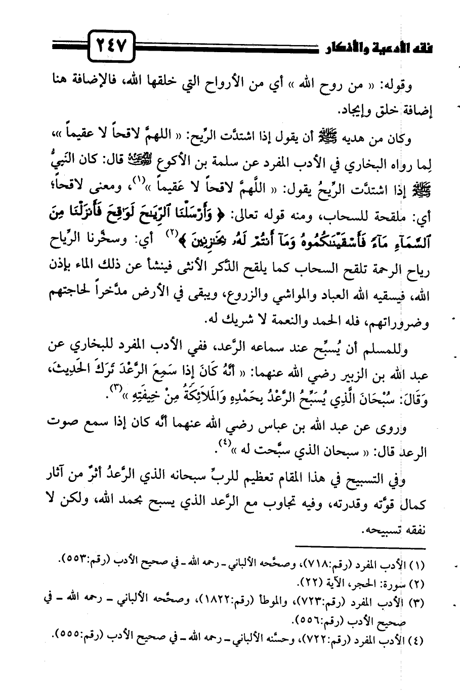 وكان من هديه صلى الله عليه وسلم أن يقول إذا اشتدَّت الرِّيح: "اللهمَّ لاقحاً لا عقيماً"، لِما رواه البخاري في الأدب المفرد عن سلمة بن الأكوع رضي الله عنه قال: كان النَبِيُّ صلى الله عليه وسلم إذا اشتدَّت الرِّيحُ يقول: "اللَّهمَّ لاقحاً لا عَقيماً" 1، ومعنى لاقحاً؛ أي: ملقحة للسحاب، ومنه قوله تعالى: {وَأَرْسَلْنَا الرِّيَاحَ لَوَاقِحَ فَأَنْزَلْنَا مِنَ السَّمَاءِ مَاءً فَأَسْقَيْنَاكُمُوهُ وَمَا أَنْتُمْ لَهُ بِخَازِنِينَ} 2 أي: وسخَّرنا الرِّياح رياح الرحمة تلقح السحاب كما يلقح الذَّكر الأنثى فينشأ عن ذلك الماء بإذن الله، فيسقيه الله العباد والمواشي والزروع، ويبقى في الأرض مدَّخراً لحاجتهم وضروراتهم، فله الحمد والنعمة لا شريك له.