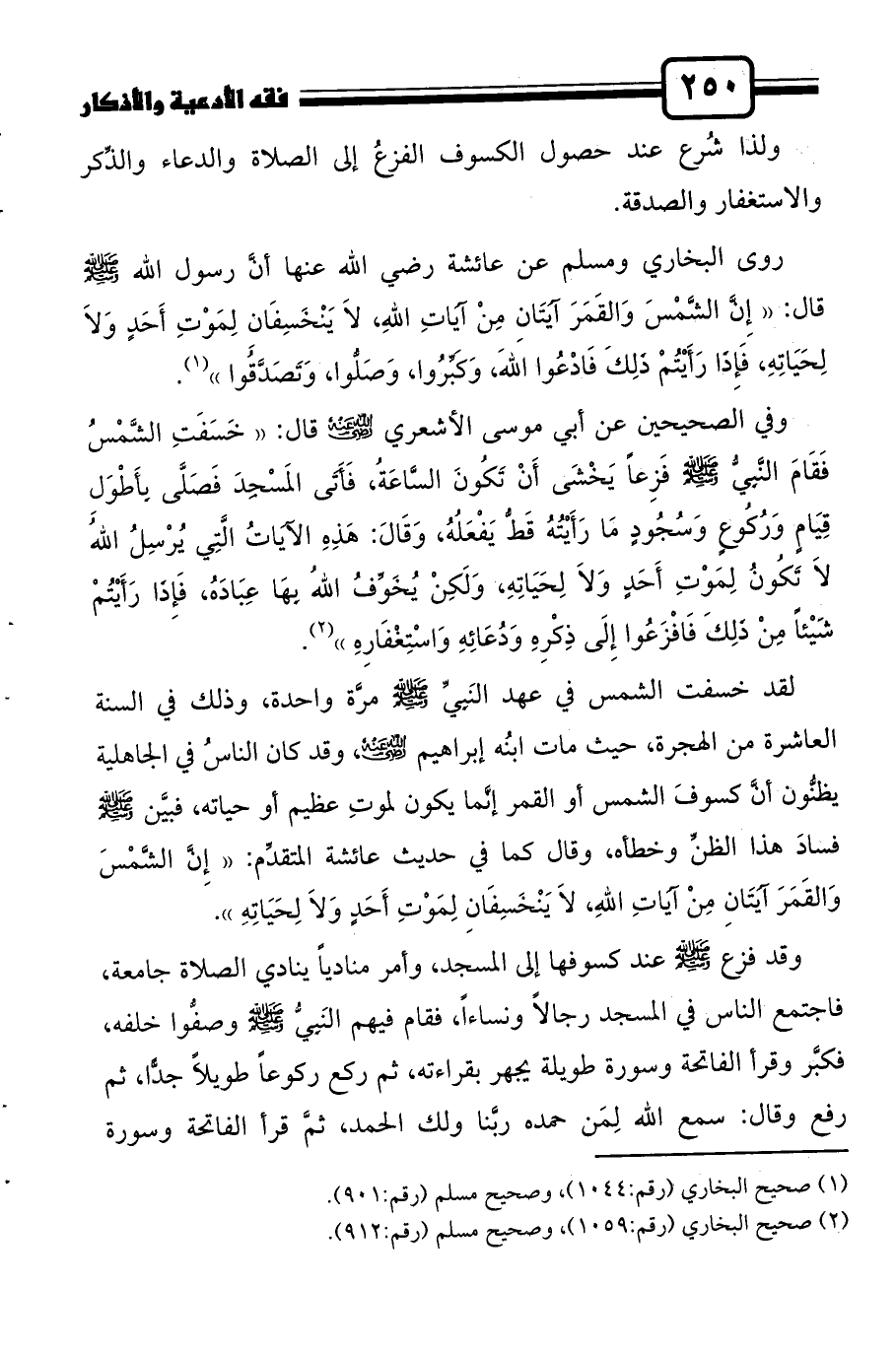 وفي الصحيحين عن أبي موسى الأشعري رضي الله عنه قال: "خَسَفَتِ الشَّمْسُ فَقَامَ النَّبِيُّ صلى الله عليه وسلم فَزِعاً يَخْشَى أَنْ تَكُونَ السَّاعَةُ، فَأَتَى المَسْجِدَ فَصَلَّى بِأَطْوَلِ قِيَامٍ وَرُكُوعٍ وَسُجُودٍ مَا رَأَيْتُهُ قَطُّ يَفْعَلُهُ، وَقَالَ: هَذِهِ الآيَاتُ الَّتِي يُرْسِلُ اللهُ لاَ تَكُونُ لِمَوْتِ أَحَدٍ وَلاَ لِحَيَاتِهِ، وَلَكِنْ يُخَوِّفُ اللهُ بِهَا عِبَادَهُ، فَإِذَا رَأَيْتُمْ شَيْئاً مِنْ ذَلِكَ فَافْزَعُوا إِلَى ذِكْرِهِ وَدُعَائِهِ وَاسْتِغْفَارِهِ"2.