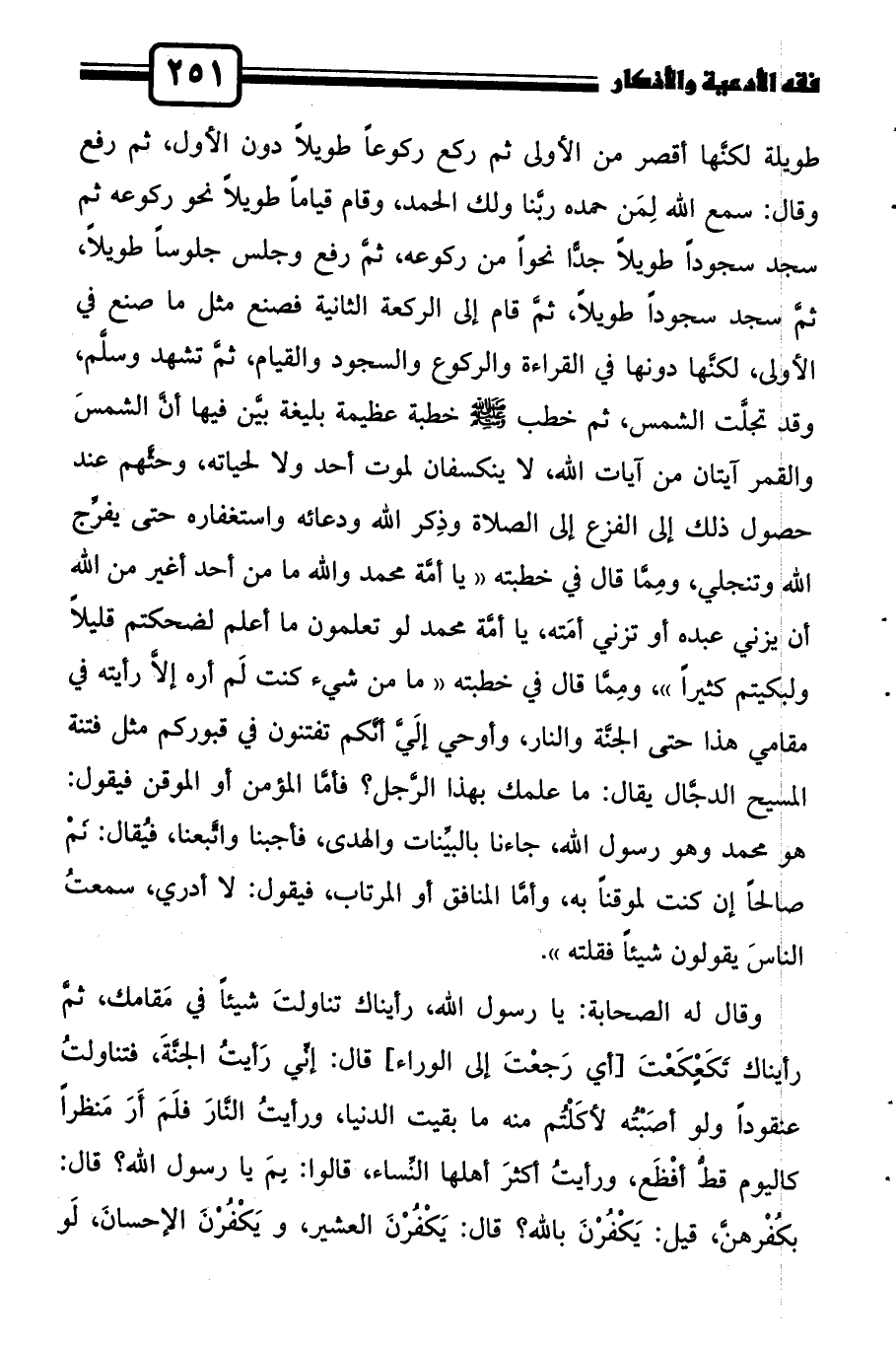 طويلة يجهر بقراءته، ثم ركع ركوعاً طويلاًَ جدًّا، ثم رفع وقال: سمع الله لِمَن حمده ربَّنا ولك الحمد، ثمَّ قرأ الفاتحة وسورة طويلة لكنَّها أقصر من الأولى ثم ركع ركوعاً طويلاً دون الأول، ثم رفع وقال: سمع الله لِمَن حمده ربَّنا ولك الحمد، وقام قياماً طويلاً نحو ركوعه ثم سجد سجوداً طويلاً جدًّا نحواً من ركوعه، ثمَّ رفع وجلس جلوساً طويلاً، ثمَّ سجد سجوداً طويلاً، ثمَّ قام إلى الركعة الثانية فصنع مثل ما صنع في الأولى، لكنَّها دونها في القراءة والركوع والسجود والقيام، ثمَّ تشهد وسلَّم، وقد تجلَّت الشمس، ثم خطب صلى الله عليه وسلم خطبة عظيمة بليغة بيَّن فيها أنَّ الشمسَ والقمر آيتان من آيات الله، لا ينكسفان لموت أحد ولا لحياته، وحثَّهم عند حصول ذلك إلى الفزع إلى الصلاة وذِكر الله ودعائه واستغفاره حتى يفرِّج الله وتنجلي، ومِمَّا قال في خطبته "يا أمَّة محمد والله ما من أحد أغير من الله أن يزني عبده أو تزني أمَته، يا أمَّة محمد لو تعلمون ما أعلم لضحكتم قليلاً ولبكيتم كثيراً"، ومِمَّا قال في خطبته "ما من شيء كنت لَم أره إلاَّ رأيته في مقامي هذا حتى الجنَّة والنار، وأوحي إلَيَّ أنَّكم تفتنون في قبوركم مثل فتنة المسيح الدجَّال يقال: ما علمك بهذا الرَّجل فأمَّا المؤمن أو الموقن فيقول: هو محمد وهو رسول الله، جاءنا بالبيِّنات والهدى، فأجبنا واتَّبعنا، فيُقال: نَمْ صالحاً إن كنت لموقناً به، وأمَّا المنافق أو المرتاب، فيقول: لا أدري، سمعتُ الناسَ يقولون شيئاً فقلته".