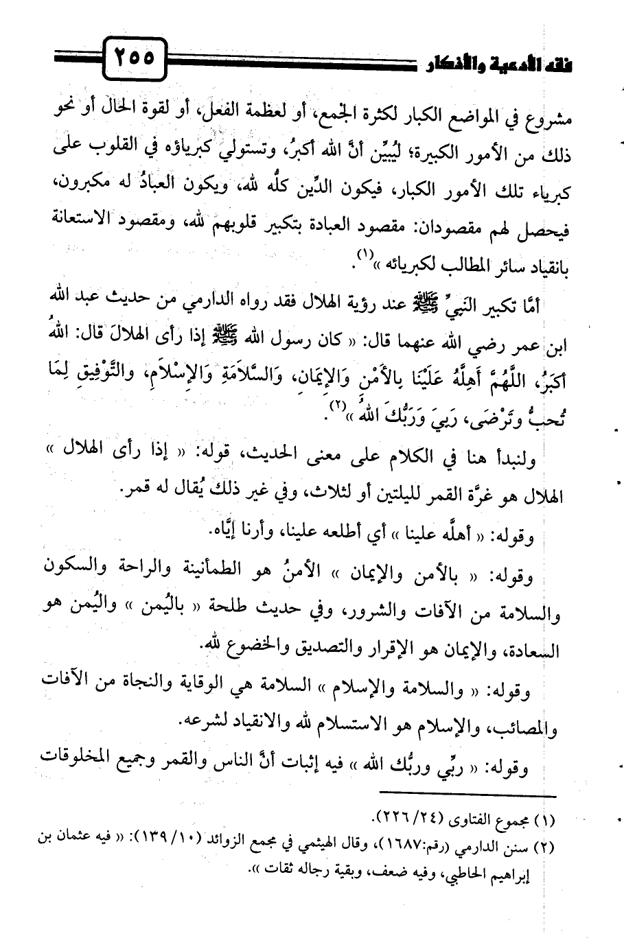 أمَّا تكبير النَبِيِّ صلى الله عليه وسلم عند رؤية الهلال فقد رواه الدارمي من حديث عبد الله ابن عمر رضي الله عنهما قال: " كان رسول الله صلى الله عليه وسلم إذا رأى الهلالَ قال: اللهُ أكبَرُ، اللَّهُمَّ أَهِلَّهُ عَلَيْنَا بِالأَمْنِ وَالإِيمَانِ، وَالسَّلاَمَةِ وَالإِسْلاَمِ، والتَّوْفِيقِ لِمَا تُحبُّ وتَرْضَى، رَبِيَ وَرَبُّكَ اللهُ"2.