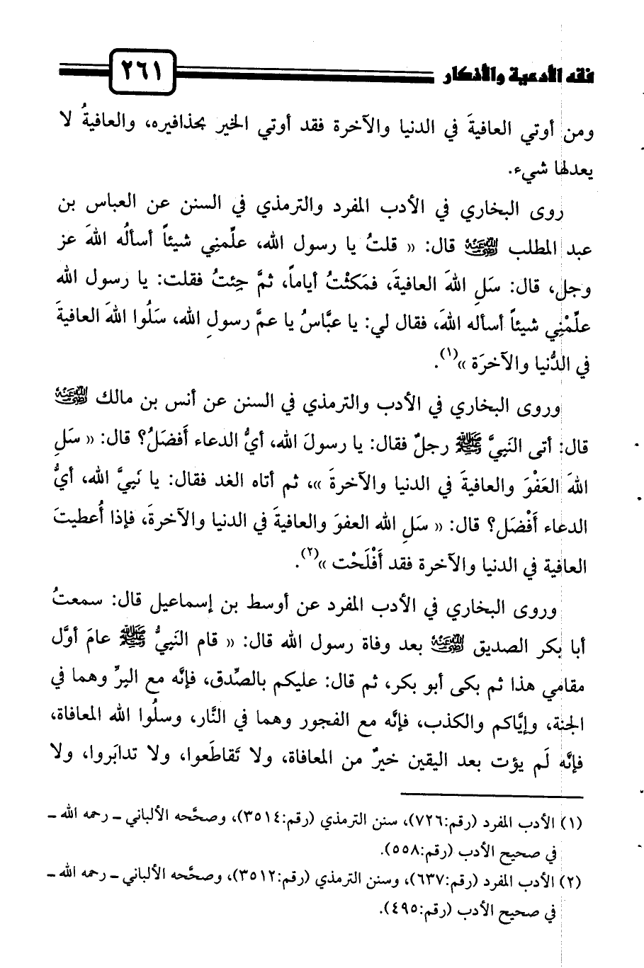 وروى البخاري في الأدب والترمذي في السنن عن أنس بن مالك رضي الله عنه قال: أتى النَبِيَّ صلى الله عليه وسلم رجلٌ فقال: يا رسولَ الله، أيُّ الدعاء أَفضَلُ قال: "سَلِ اللهَ العَفْوَ والعافيةَ في الدنيا والآخرةَ"، ثم أتاه الغد فقال: يا نَبِيَّ الله، أيُّ الدعاء أَفْضَل قال: "سَلِ الله العفوَ والعافيةَ في الدنيا والآخرةَ، فإذا أُعطيتَ العافية في الدنيا والآخرة فقد أَفْلَحْت"2.