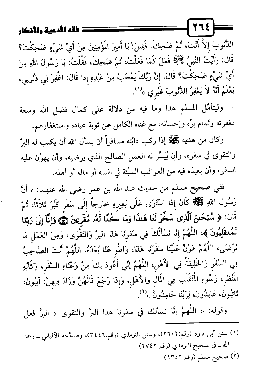 ففي صحيح مسلم من حديث عبد الله بن عمر رضي الله عنهما: "أَنَّ رَسُولَ اللهِ صلى الله عليه وسلم كَانَ إِذا اسْتَوَى عَلَى بَعِيرِهِ خَارِجاً إِلَى سَفَرٍ كَبَّرَ ثَلاَثاً، ثُمَّ قَالَ: {سُبْحَانَ الَّذِي سَخَّرَ لَنَا هَذَا وَمَا كُنَّا لَهُ مُقْرِنِينَ وَإِنَّا إِلَى رَبِّنَا لَمُنْقَلِبُونَ} ، اللَّهُمَّ إِنَّا نَسْأَلُكَ فِي سَفَرِنَا هَذَا البِرَّ وَالتَقْوَى، وَمِنَ العَمَلِ مَا تَرْضَى، اللَّهُمَّ هَوِّنْ عَلَيْنَا سَفَرَنَا هَذَا، وَاطْوِ عَنَّا بُعْدَهُ، اللَّهُمَّ أَنْتَ الصَّاحِبُ فِي السَّفَرِ وَالخَلِيفَةُ فِي الأَهْلِ، اللَّهُمَّ إنِّي أَعُوذ بِكَ مِنْ وَعْثَاءِ السَّفَرِ، وَكَآبَةِ المَنْظَرِ، وَسُوءِ المُنْقَلَبِ فِي المَالِ وَالأَهْلِ، وَإِذَا رَجَعَ قَالَهُنَّ وَزَادَ فِيهِنَّ: آيِبُونَ، تَائِبُونَ، عَابِدُونَ، لِرَبِّنَا حَامِدُونَ "2.