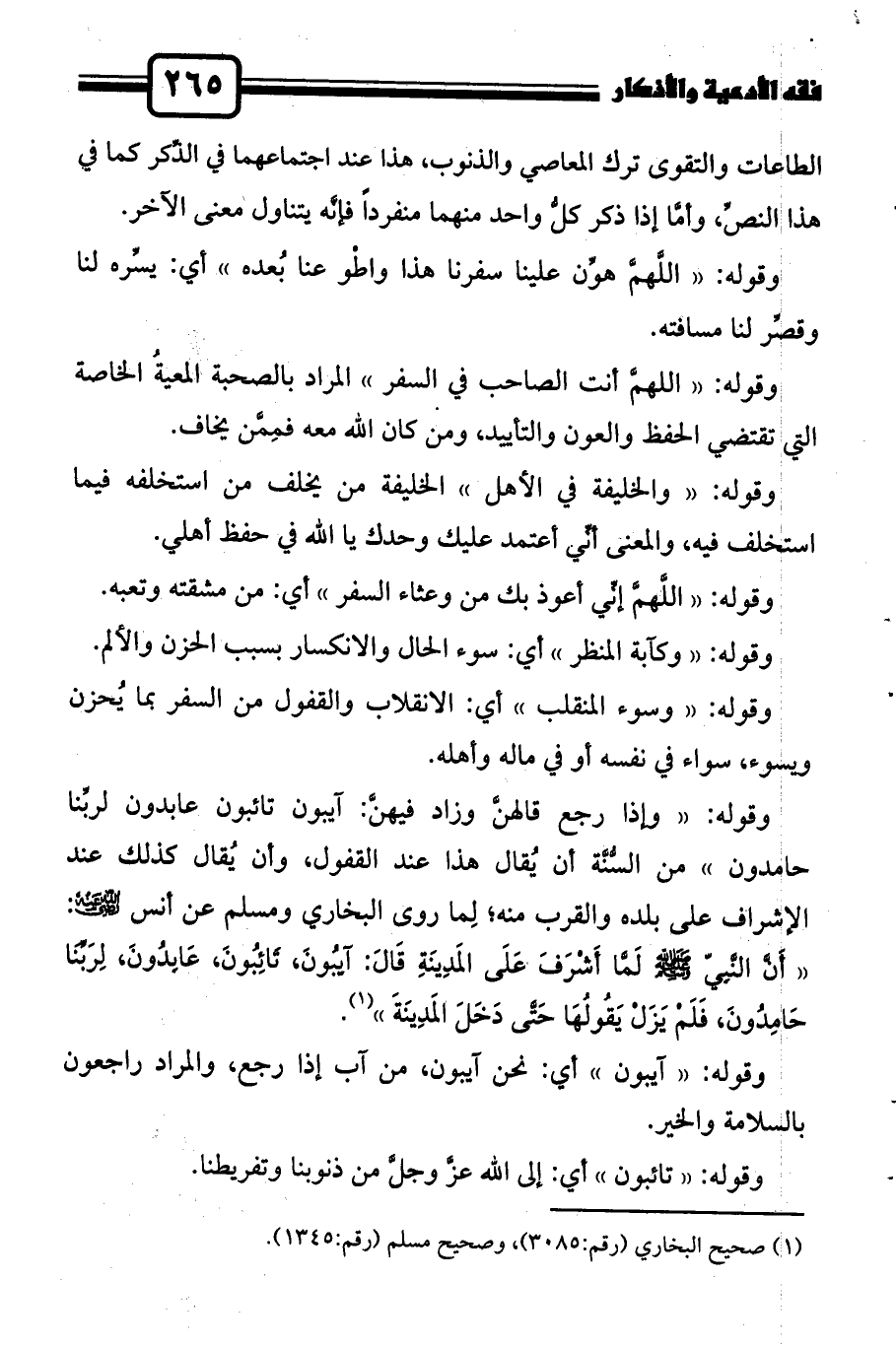 وقوله: "وإذا رجع قالهنَّ وزاد فيهنَّ: آيبون تائبون عابدون لربِّنا حامدون" من السُّنَّة أن يُقال هذا عند القفول، وأن يُقال كذلك عند الإشراف على بلده والقرب منه؛ لِما روى البخاري ومسلم عن أنس رضي الله عنه: "أَنَّ النَّبِيّ صلى الله عليه وسلم لَمَّا أَشْرَفَ عَلَى المَدِينَةِ قَالَ: آيِبُونَ، تَائِبُونَ، عَابِدُونَ، لِرَبِّنَا حَامِدُونَ، فَلَمْ يَزَلْ يَقُولُهَا حَتَّى دَخَلَ المَدِينَةَ "1.