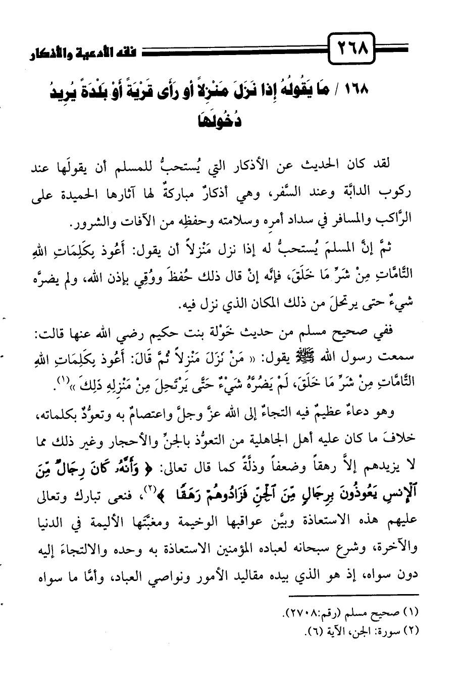 168 / مَا يَقُولُهُ إِذا نَزَلَ مَنْزِلاً أو رَأَى قَرْيَةً أَوْ بَلْدَةً يُرِيدُ دُخُولَهَا