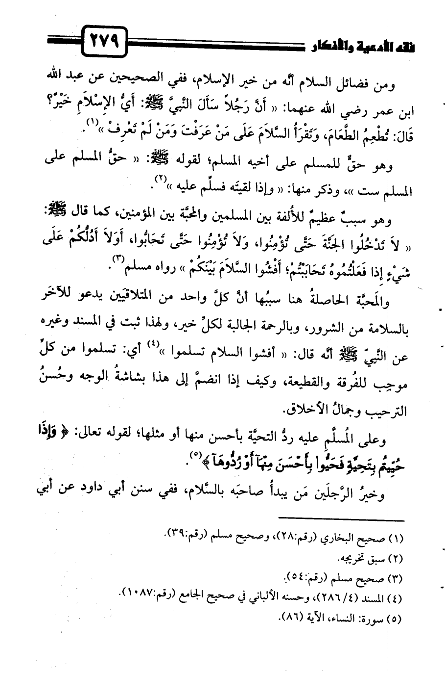والمَحبَّة الحاصلةُ هنا سببُها أنَّ كلَّ واحد من المتلاقيَين يدعو للآخَر بالسلامة من الشرور، وبالرحمة الجالبة لكلِّ خير، ولهذا ثبت في المسند وغيره عن النَّبِيِّ صلى الله عليه وسلم أنَّه قال: " أفشوا السلام تسلموا "4 أي: تسلموا من كلِّ موجِب للفُرقة والقطيعة، وكيف إذا انضمَّ إلى هذا بشاشةُ الوجه وحُسنُ الترحيب وجمالُ الأخلاق.