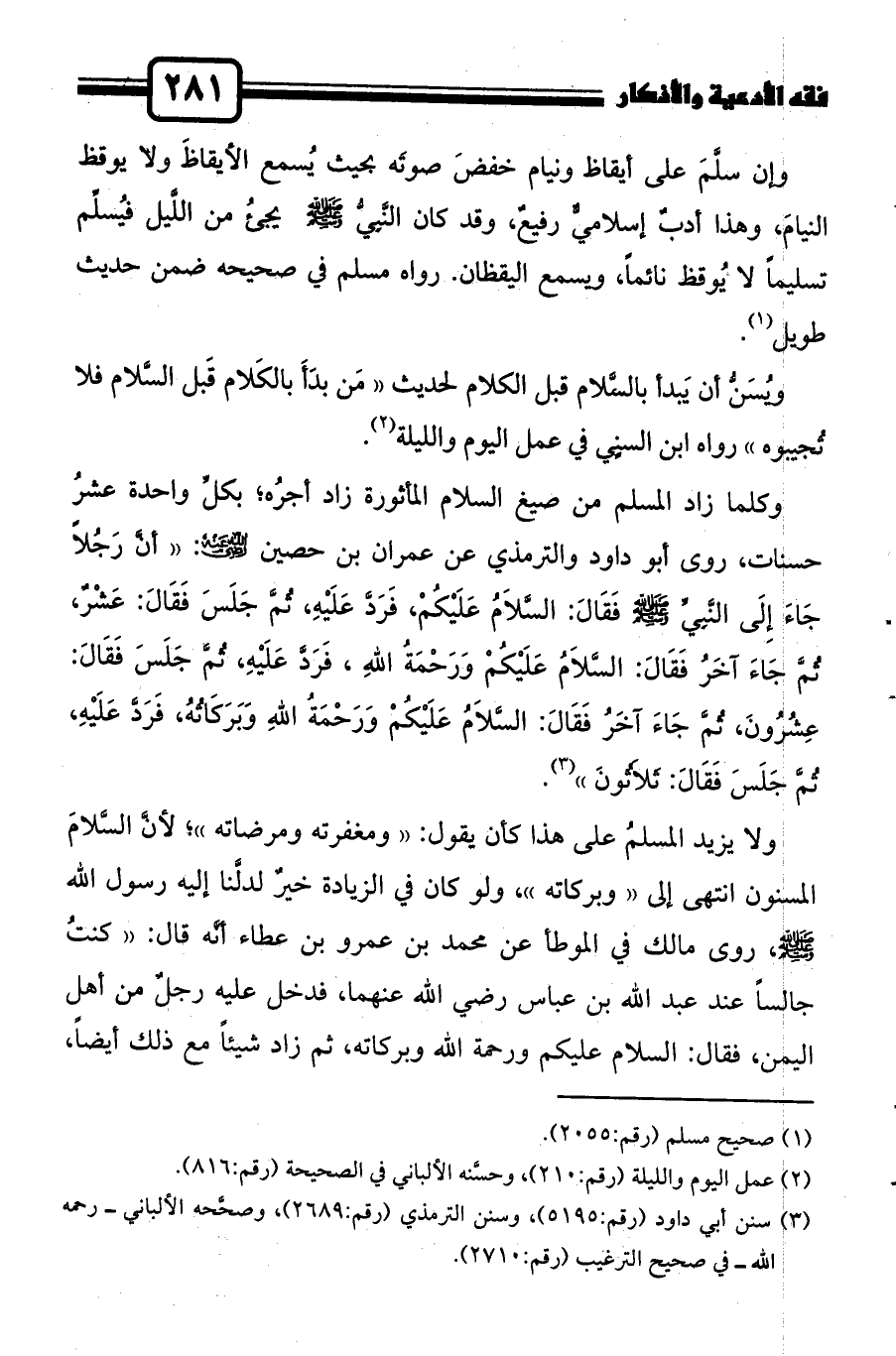 وكلما زاد المسلم من صيغ السلام المأثورة زاد أجرُه؛ بكلِّ واحدة عشرُ حسنات، روى أبو داود والترمذي عن عمران بن حصين رضي الله عنه: " أنَّ رَجُلاً جَاءَ إِلَى النَّبِيِّ صلى الله عليه وسلم فَقَالَ: السَّلاَمُ عَلَيْكُمْ، فَرَدَّ عَلَيْهِ، ثُمَّ جَلَسَ فَقَالَ: عَشْرٌ، ثُمَّ جَاءَ آخَرُ فَقَالَ: السَّلاَمُ عَلَيْكُمْ وَرَحْمَةُ اللهِ، فَرَدَّ عَلَيْهِ، ثُمَّ جَلَسَ فَقَالَ: عِشُرُونَ، ثُمَّ جَاءَ آخَرُ فَقَالَ: السَّلاَمُ عَلَيْكُمْ وَرَحْمَةُ اللهِ وَبَرَكَاتُهُ، فَرَدَّ عَلَيْهِ، ثُمَّ جَلَسَ فَقَالَ: ثَلاَثُونَ "3.