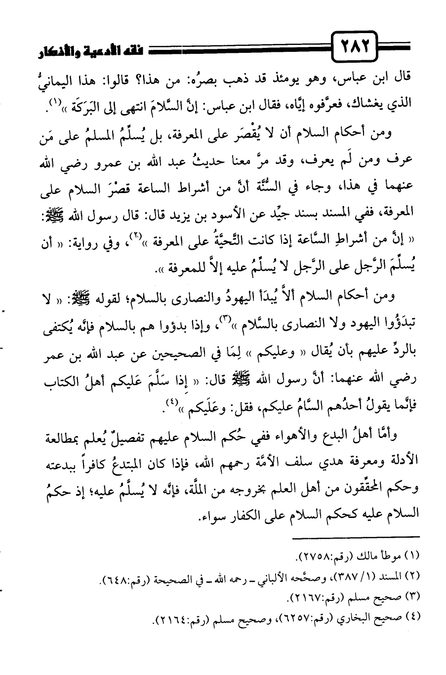 ومن أحكام السلام أن لا يُقْصَر على المعرفة، بل يُسلِّمُ المسلمُ على مَن عرف ومن لَم يعرف، وقد مرَّ معنا حديثُ عبد الله بن عمرو رضي الله عنهما في هذا، وجاء في السُّنَّة أنَّ من أشراط الساعة قصْرَ السلام على المعرفة، ففي المسند بسند جيِّد عن الأسود بن يزيد قال: قال رسول الله صلى الله عليه وسلم: "إنَّ من أشراطِ السَّاعة إذا كانت التَّحيَّةُ على المعرفة"2، وفي رواية: "أن يُسلِّمَ الرَّجل على الرَّجل لا يُسلِّمُ عليه إلاَّ للمعرفة".