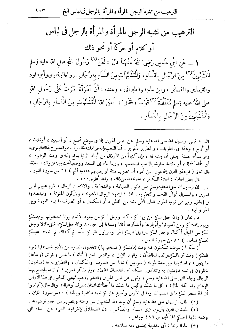 1 - عن ابن عباس رضي الله عنهما قال: "لعن (¬1) رسول الله صلى الله عليه وسلم المتشبهين (¬2) من الرجال بالنساء، والمتشبهات من النساء بالرجال" رواه البخاري وأبو داود والترمذي والنسائي، وابن ماجة والطبراني، وعنده: أن امرأة مَرَّتْ على رسول الله صلى الله عليه وسلم مُتقلدةً (¬3) قَوْساً، فقال: لعن الله المتشبهات من النساء بالرجال، والمتشبهين من الرجال بالنساء